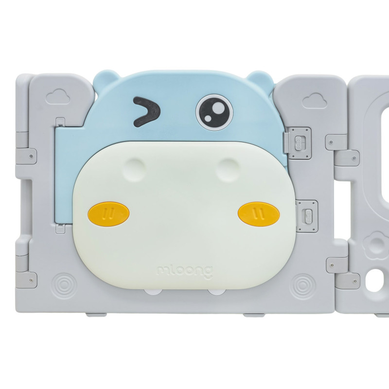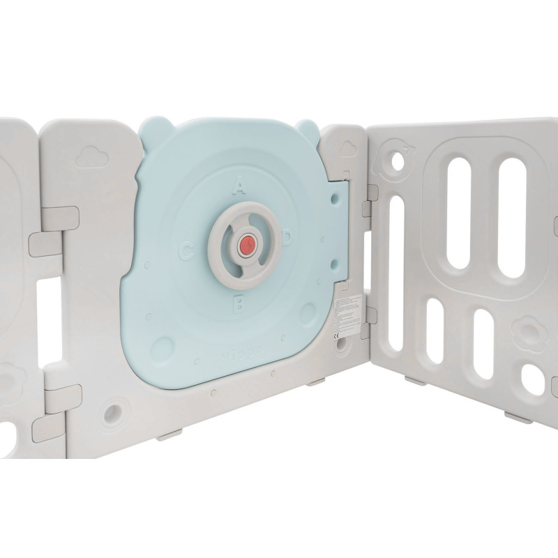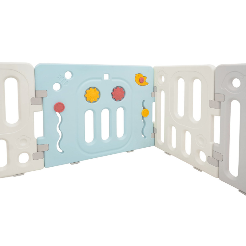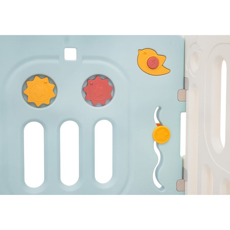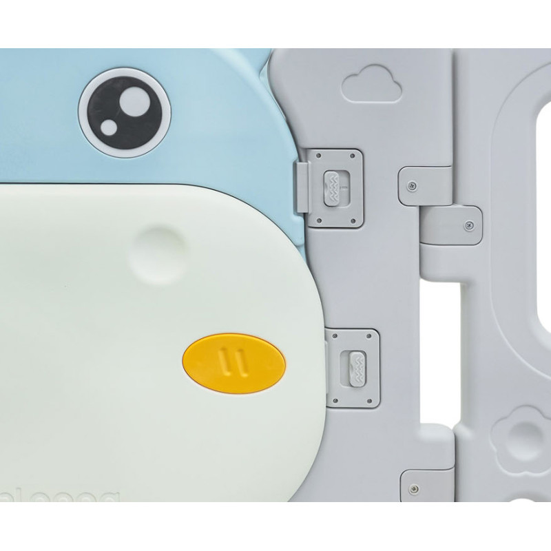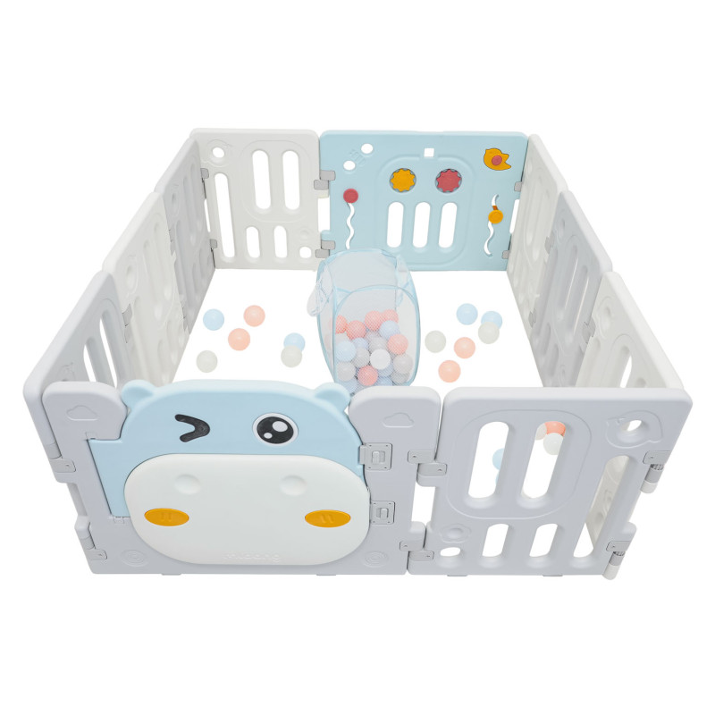 Didelis, praktiškas, sulankstomas modulinis žaidimų kilimėlis, skirtas vaikui nuo 6 mėnesių amžiaus. Iš aptvaro galime sudėlioti bet kokią konstrukciją pagal savo pageidavimus, jį labai lengva sulankstyti ir išskleisti, jis yra stabilus ir turi lygius kraštus. Žaidimų lovytės viduje įrengti manipuliatyvūs elementai, pavyzdžiui, slankiojantis ratas, krumpliaračiai, švilpukas arba vairas. Rinkinys pagamintas iš patvarių ir netoksiškų medžiagų, jį sudaro 10 skydelių. Durelių skydelis užsirakina, neleisdamas vaikui atidaryti durelių iš lauko pusės. Neslystančios kojelės neleidžia žaidimų aikštelei slysti. Žaidimų lovytėje jūsų kūdikis turės pakankamai erdvės laisvai judėti ir kartu bus saugus. Į komplektą taip pat įeina krepšys kamuoliukams ir 40 kamuoliukų.