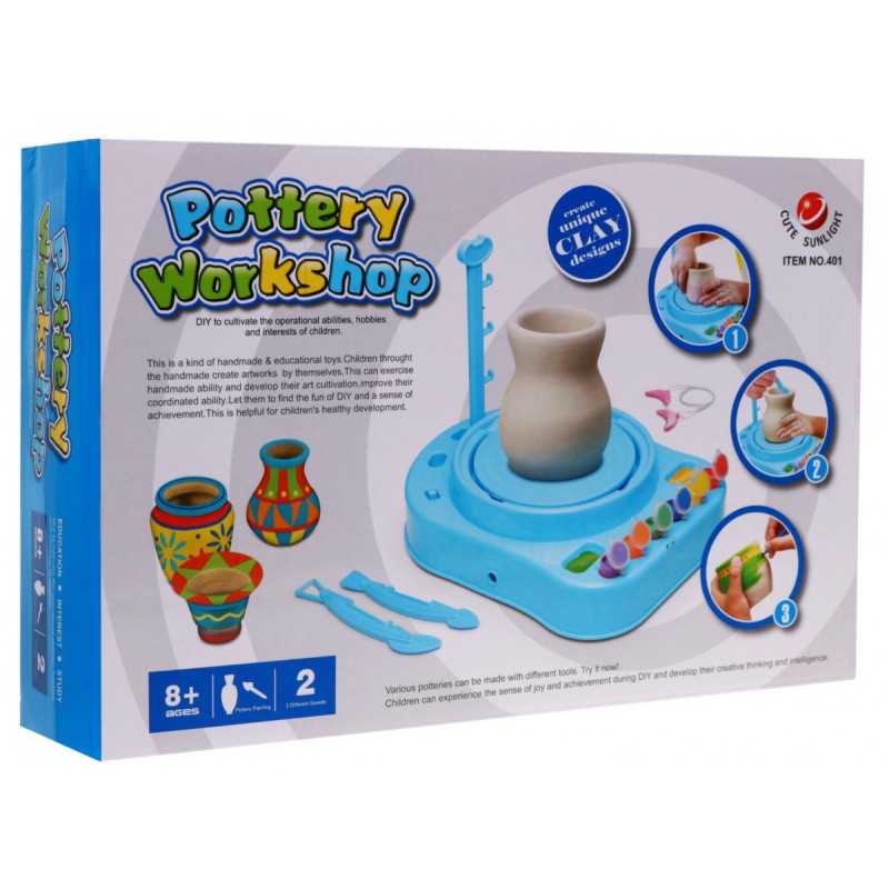 | Mažojo puodžiaus rinkinys - tai lavinamasis žaislas, skirtas keraminiams indams gaminti ir dažyti. Vaikas gali pats pasigaminti puodus, puodelius ar ąsočius, o paskui juos dekoruoti dažais pagal savo sumanymą. Puodžiaus ratas sukasi dviem greičiais - lėčiau ir greičiau. Žaislas lavina vaizduotę, ugdo vikrumą, rankų ir plastikos įgūdžius. Žaislas skirtas vaikams nuo 8 metų, turi CE sertifikatą. Žaislas maitinamas 3 x R14 baterijomis (į komplektą neįeina). | |