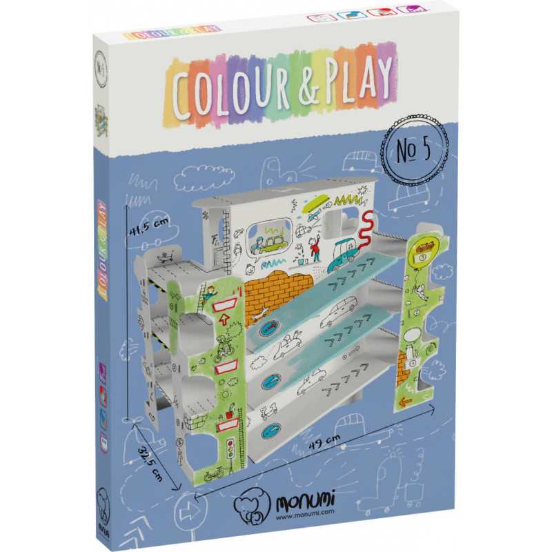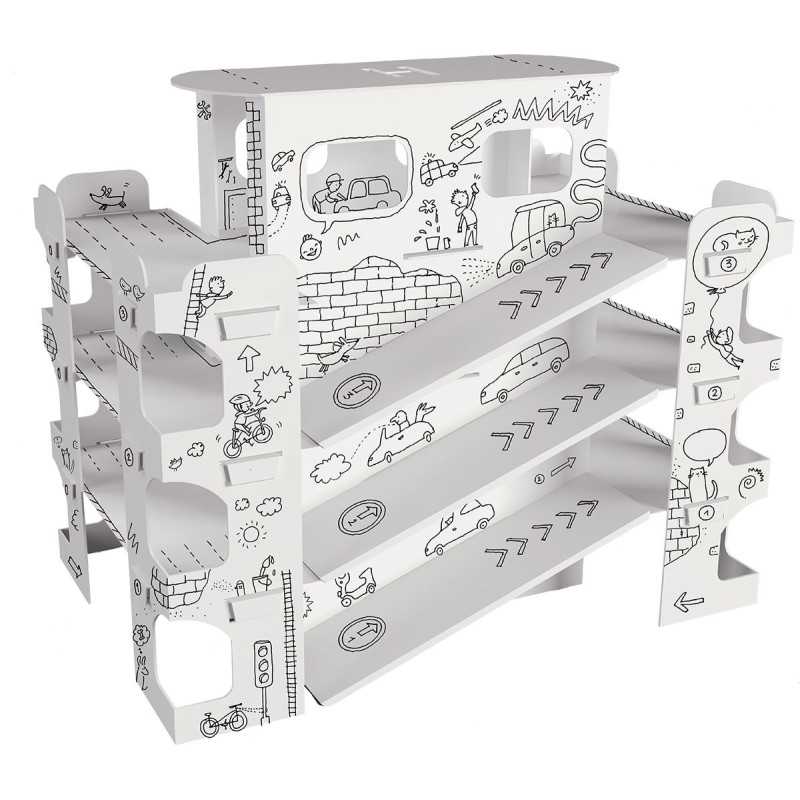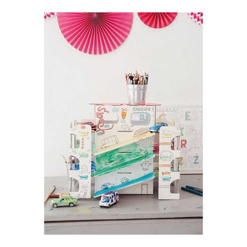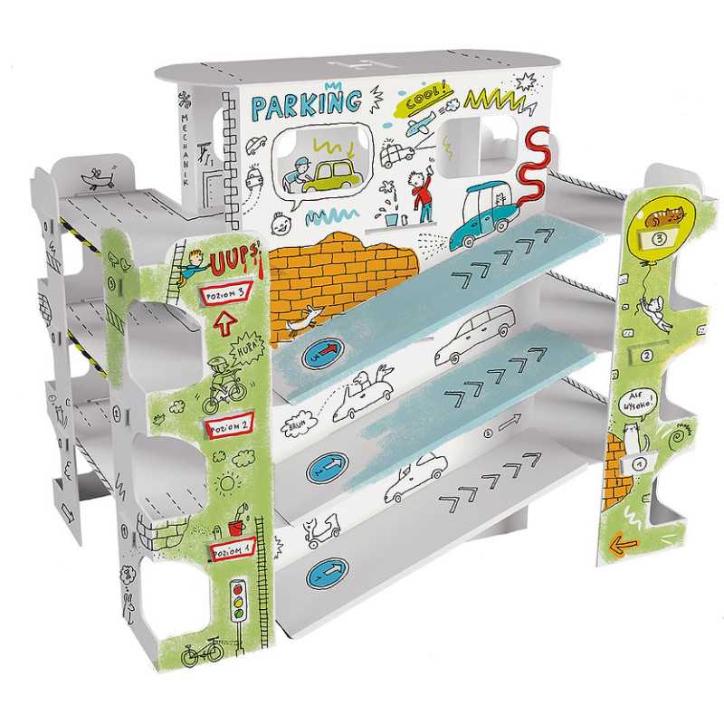 | Didelė spalvinama ir sulankstoma automobilių aikštelė, skirta vaikams nuo 3 metų amžiaus. Dideli, tiksliai iškirpti elementai, lengvai surenkami be klijų ar žirklių. Vaizdinė instrukcija pakuotės kitoje pusėje. Judančios dalys, atviros erdvės ir lentynos daro žaislą patrauklesnį. Konstrukcija yra stabili, patvari ir lengva. Profesionali grafika, aiški juoda spauda. Tinka spalvinti kreidelėmis, flomasteriais, žymekliais ir dažais. Kartonas gerai sugeria drėgmę ir nesilanksto. |