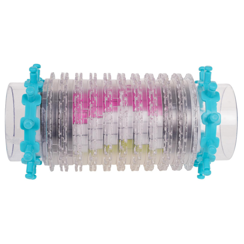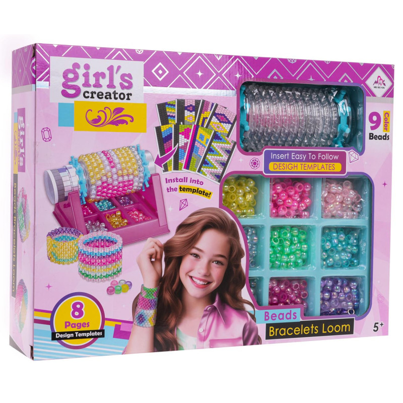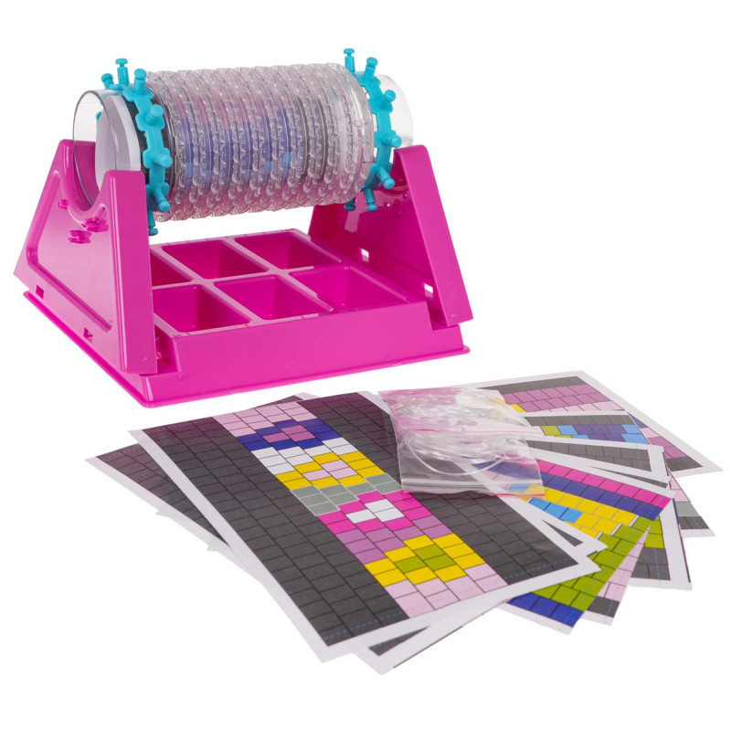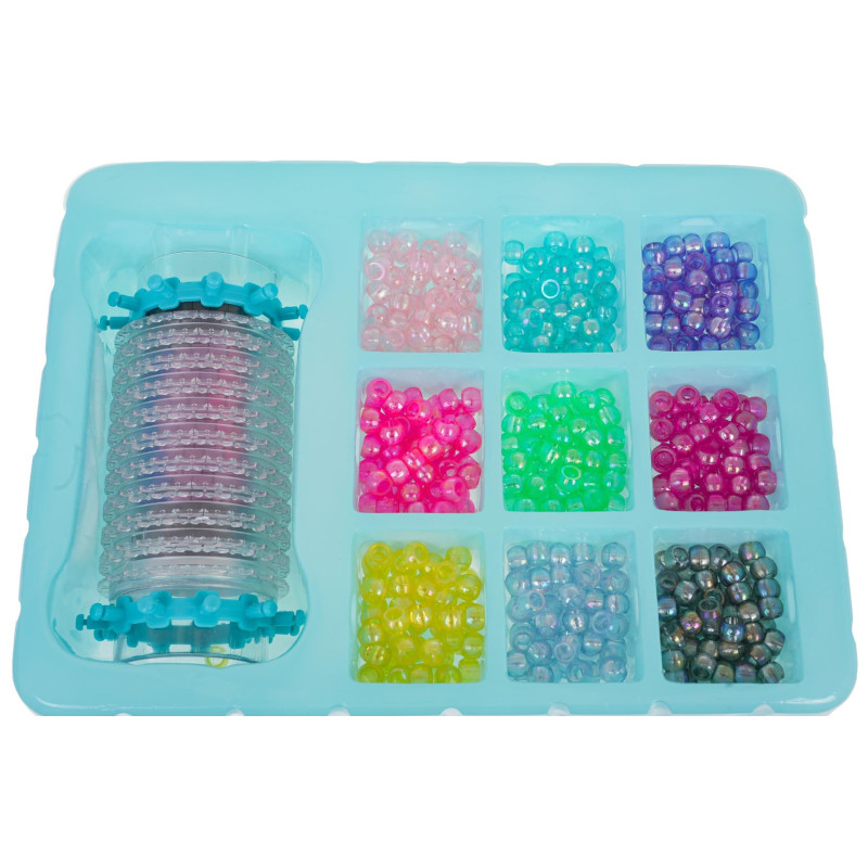 Apyrankių gamybos rinkinys su stakliais ir priedais, skirtas vaikams nuo 5 metų amžiaus. Rinkinį sudaro staklės, 8 pavyzdžiai ir 540 karoliukų, suskirstytų į 9 spalvas. Naudoti apyrankių stakles paprasta: tiesiog uždėkite plastikinį vamzdelį ant stovelio. Supilkite karoliukus į stovelį, kiekvieną spalvą į atskirą skyrių, kad būtų lengviau. Pasirenkame modelį, kurį norime sukurti, arba gaminame apyrankę pagal savo idėją. Dedame karoliukus ant vamzdelio ir pradedame pynimą, judėdami nuo dešinės pusės į kairę. Siūlą veriame pakaitomis aukštyn ir žemyn. Veiksmus kartojame visose karoliukų eilėse. Baigus pynimą, atsargiai nuimame apyrankę nuo vamzdelio. Rinkinys lavina rankų įgūdžius ir kūrybiškumą.