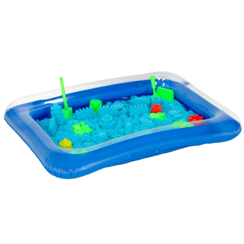 Į rinkinį taip pat įeina 56 x 40 cm dydžio pripučiama smėlio dėžė, kuri yra puikus priedas prie kinetinio smėlio žaidimų.