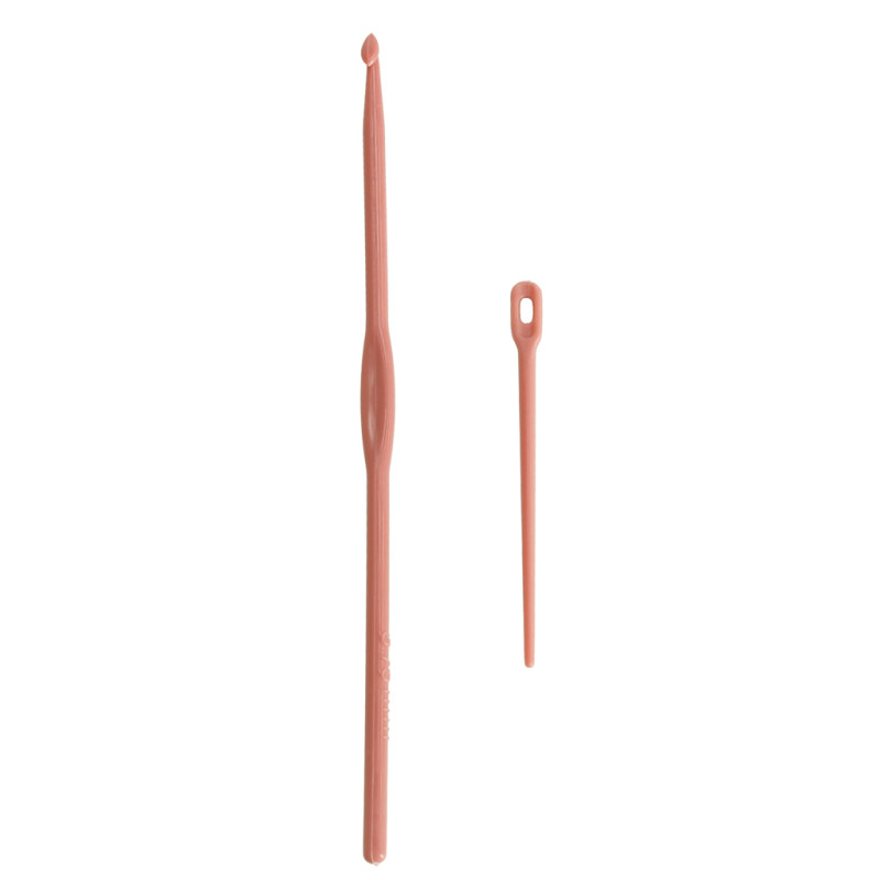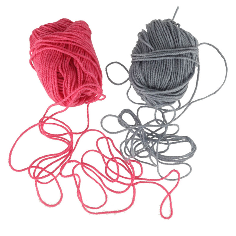 Rinkinyje yra du siūlų kamuoliukai: tamsiai pilkos, šviesiai pilkos, rožinės ir smėlio spalvos, taip pat adata ir nėrimo kabliukas, kurie padės užbaigti projektus ir pridėti unikalių detalių.