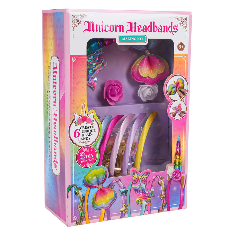 Aplikacijos: vienaragio ragas, lankas (kaspinas), 3 x gėlės, 2 x ausys, vienaragio ragas (papildomas), trys drugeliai, vienaragis su blizgučiais, 5 žvaigždės, 2 x segtukai, juosta su auksinėmis laputėmis.
