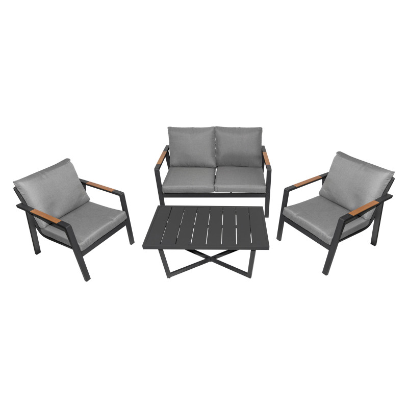 | Aprašymas | Aliuminio sodo baldai Sofa + du foteliai + stalas |