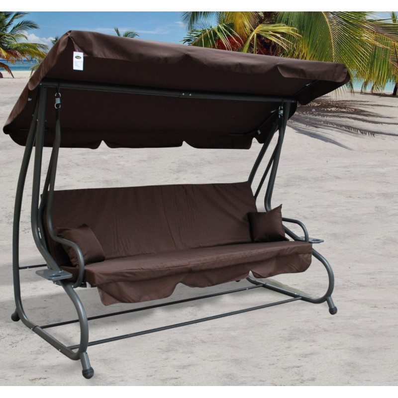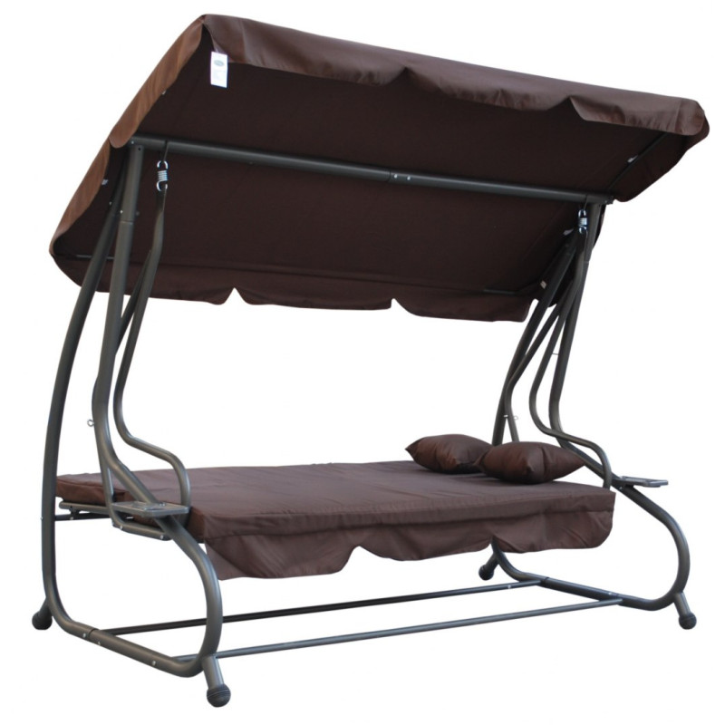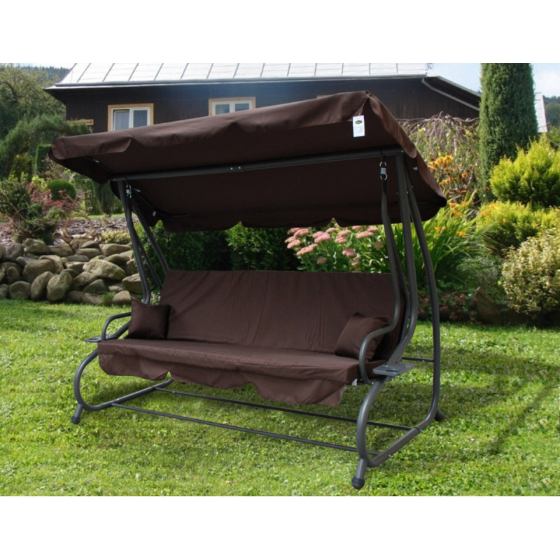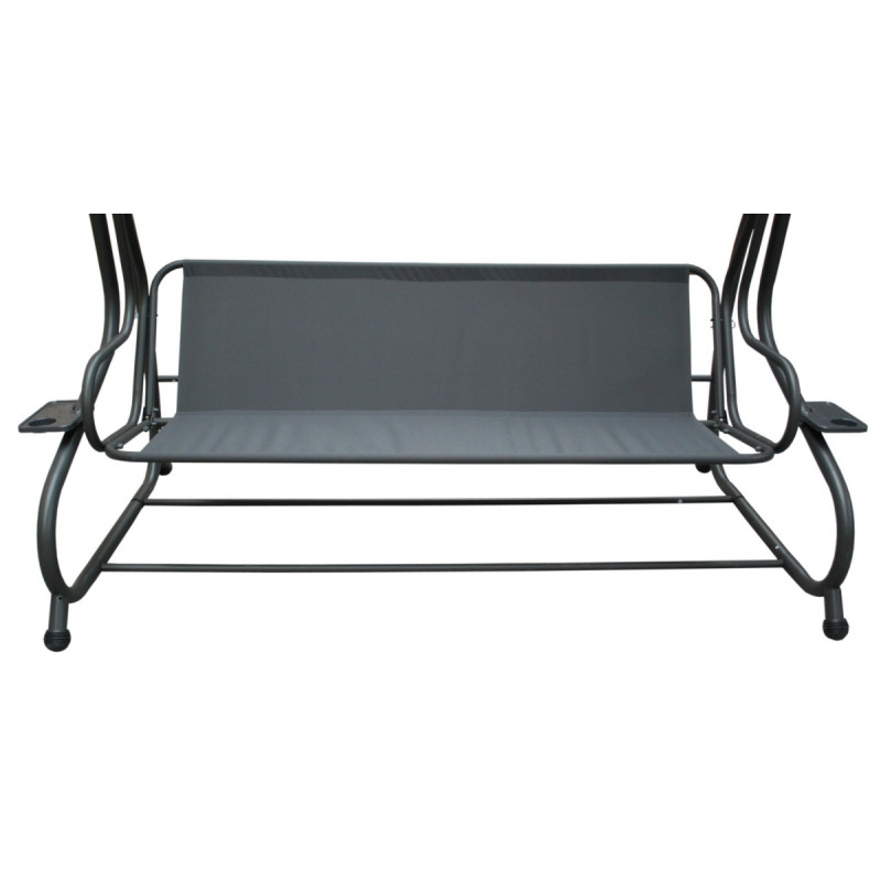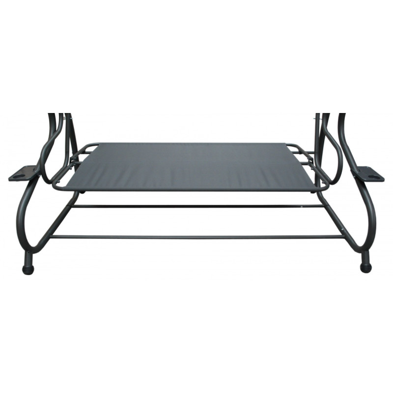 | Sėdynė pagaminta iš "Textiline" medžiagos su 2x1 pynimu, Medžiaga, iš kurios pagamintas tinklelis, pagaminta iš vinilu dengtų poliesterio siūlų. Dėl didelio atsparumo nepalankioms oro sąlygoms Textiline yra skirta naudoti lauke. Tinklelis yra itin lankstus ir atsparus tempimui, kuris papildomai veikia naudojimo komfortą, o pati medžiaga nesideformuoja. 2 pagalvėlės ir sėdynės čiužinys (apmušalų kempinė 10 cm), daugiapakopis sklandus skydelio reguliavimas, skydelio užvalkalas iš poliesterio, kurio svoris 180 g. išskleidžiama patogi sėdynė, kurią galima naudoti ir sėdint, ir gulint, 2 padėkliukai gėrimams, sūpynių tvirtinimas ant spyruoklių, konstrukcija pagaminta iš milteliniu būdu dažyto plieno, aukštos kokybės suvirinimo siūlės, didelis atsparumas oro sąlygoms, ant kojų galų masyvi neslystanti guma, lengva palaikyti švarą, sėdynės užvalkalas pagamintas iš poliesterio, kurio svoris 160 g., didžiausia apkrova 300 kg, |