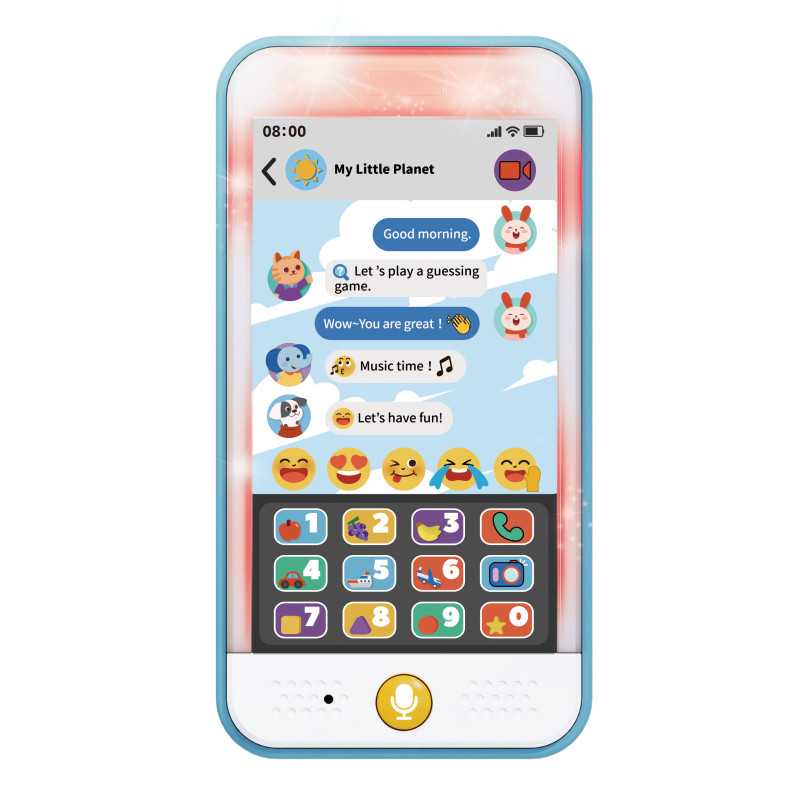 Interaktyvus, daugiafunkcinis, saugus išmanusis telefonas vaikams nuo 6 mėnesių amžiaus. Išmanusis telefonas pagamintas iš geriausios kokybės plastiko, jame nėra smulkių dalių ar aštrių briaunų. Žaislas turi garsumo reguliatorių ir veikia dviem režimais - klausimų ir atsakymų bei atradimų režimu. Klausimo ir atsakymo režimu žaislas paprašys vaiko surasti tinkamą mygtuką su vaisiumi, forma arba skaičiumi. Už teisingą atsakymą jis apdovanoja džiugiu garsu, o už neteisingą - klaidos garsu ir skatina bandyti dar kartą. Atradimo režimu vaikas gali apsimesti, kad žaidžia, kalbėtis, skambinti, fotografuoti ir klausytis muzikos. Paspaudus bet kurį planšetės viršuje esantį mygtuką, mirksi raudonas šviesos diodas. Telefonas pagamintas iš patvarios, nedūžtančios medžiagos. Subtitrai ir garsai pateikiami anglų kalba. Žaislas maitinamas 3 x AAA baterijomis, baterijos į komplektą neįtrauktos. Skydelis su mygtukais: