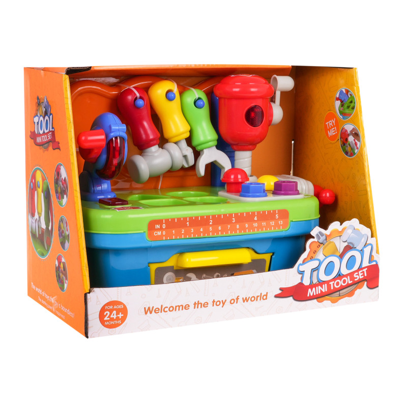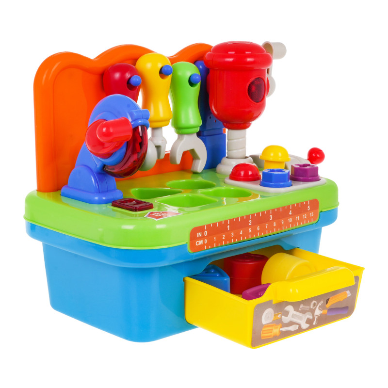 Daugiafunkcinis, interaktyvus žaislas su garso ir šviesos funkcija skirtas vaikams nuo 24 mėnesių amžiaus. Dirbtuvėlėje "Pasidaryk pats" yra daugybė skirtingų funkcijų. Čia rasite besisukantį diskinį pjūklą ir smūginį plaktuką. Kiekvienas įrankis turi praktišką rankenėlę, kuria galime jį įjungti. Ant darbastalio įrengtas spaustuvas, kuris leis mūsų kūdikiui išmokti varžtų įsukimo ir atsukimo reflekso, kurį lydės barškėjimo garsai. Dirbtuvėlėje rasime vinių, skirtų įkalti, ir varžtų, skirtų prisukti. Papildomą įrangą sudaro įrankiai: atsuktuvas, veržliaraktis ir plaktukas, kurių proporcijos puikiai tinka mažoms vaikų rankoms. Dirbtuvės taip pat yra puiki vieta lavinti gebėjimą atpažinti formas ir jas derinti. Dirbtuvių stalo stalviršyje įrengtas rūšiuoklis, kuris puikiai lavina vaiko įgūdžius. Visus elementus, kuriuos įdedame į atitinkamas skylutes, galima rasti žaislo apačioje esančiame praktiškame stalčiuje. Dirbtuvės maitinamos 3 x AG13 baterijomis, baterijos yra komplekte. Dirbtuvės specifikacijos: - Dirbtuvėlių komplektas: - ryškios, akį džiuginančios spalvos, - besisukantis diskinis pjūklas su šviesa ir garsu, - judantis smogiamasis plaktukas su šviesa ir garsu, - kilnojamasis spaustuvas su ištraukimo ir įtraukimo judesiu, - atidaromas stalčius dirbtuvių reikmenims laikyti, - formų rūšiuotuvas, - galimybė plaktuku įkalti vinis, - gebėjimas įsukti ir išsukti varžtus veržliarakčiu arba atsuktuvu. |