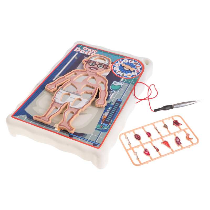 Žaidimas "Crazy Doctor" skirtas vaikams nuo 4 metų. Šiame žaidime atliekame gydytojo vaidmenį ir atliekame operaciją. Mūsų pacientas turi 12 skirtingų kūno vietų, į jas reikia tinkamai išdėstyti organus. Tada sukame ratą ir tikriname, į ką rodo rodyklė. Atsitiktinai parinktą organą reikia atsargiai pašalinti iš nurodytos dalies. Jei net lengvai paliesime paciento paviršių, jis sudrebės, pradės dunksėti ir mums nepavyks jo išgelbėti. Žaidimas reikalauja susikaupimo ir tikslumo bei moko rankų ir akių koordinacijos. Lentos gale yra dėtuvė, į kurią galima sudėti visus priedus. Žaislas maitinamas 3 x AA 1, 5 V baterijomis, kurios į rinkinį neįeina. Žaidimo taisyklės: