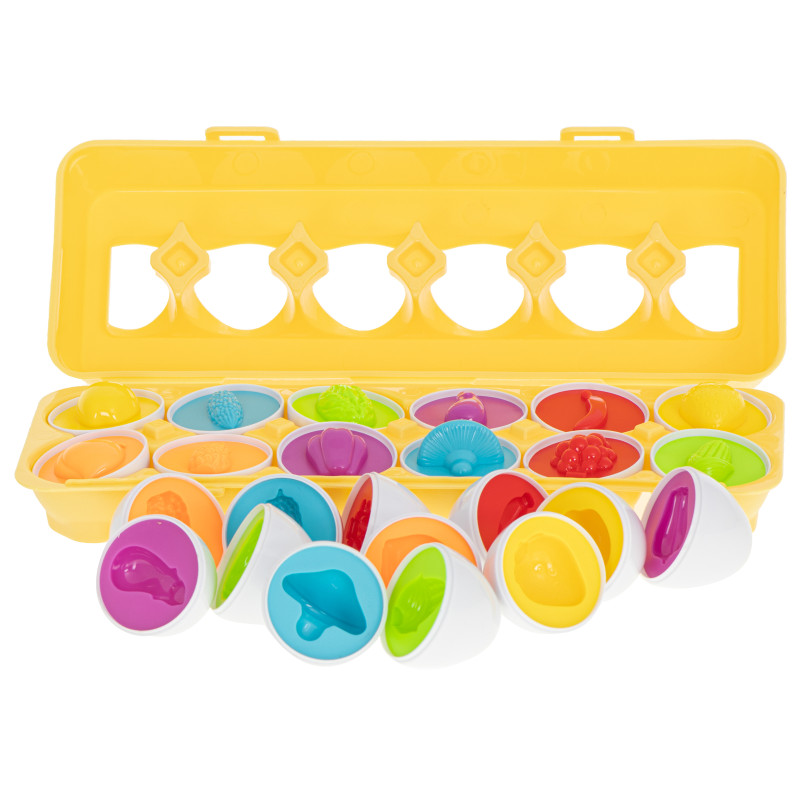 Rinkinyje rasite 12 kiaušinių, po lukštais slepiančių skirtingas formas ir spalvas.