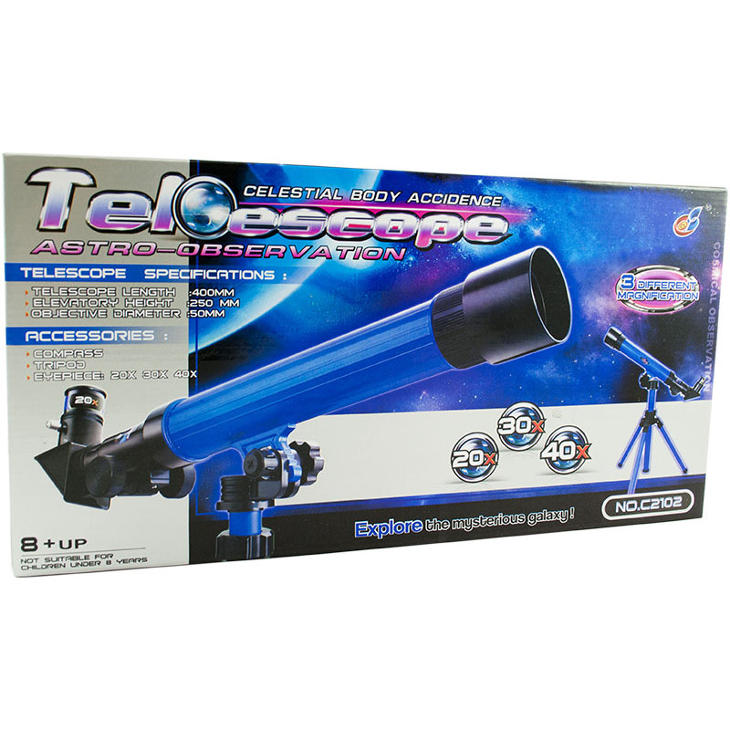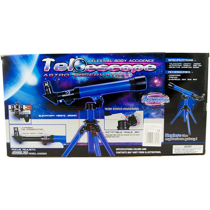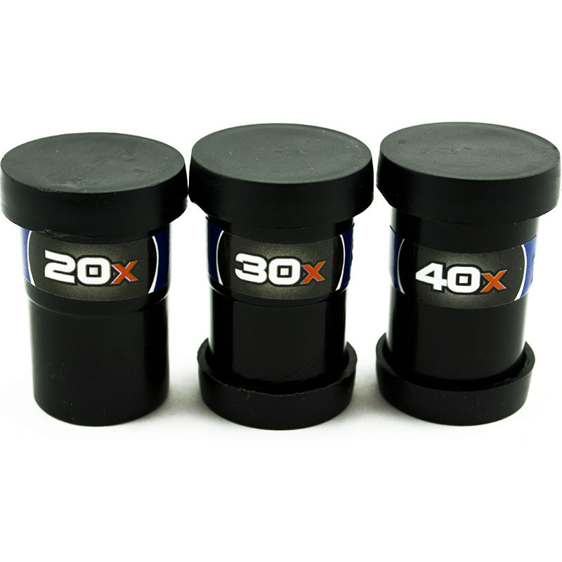 Teleskopas su keičiamais skirtingų galių objektyvais (20x, 30x, 40x).