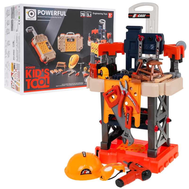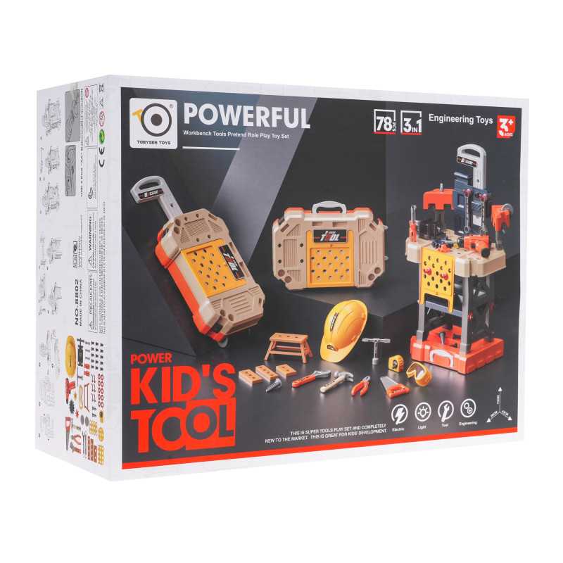 Įrankių rinkinys "3in1", skirtas mažiesiems "pasidaryk pats" entuziastams nuo 3 metų. Iš šio rinkinio galime pasigaminti darbo stalą arba paversti jį lagaminu skirtu susidėti rinkinyje esantiems įrankiams. Galime sukonstruoti lagaminą su rankena nešiojimui arba lagaminą ant ratukų stumdymui. Rinkinyje yra 78 elementai, pavyzdžiui, dirbtuvių komponentai, šalmas, pjūklas, atsuktuvai, akumuliatorinis gręžtuvas, daug varžtų ir kt. Atsuktuvas maitinamas 2 x 1, 5 V AA tipo baterijomis, baterijos į komplektą neįtrauktos. Atsuktuvas ir (arba) grąžtas veikia kaip tikras, jis atsuka ir atsuka varžtus, o dirbant šviečia raudonas šviesos diodas žaislo priekyje.