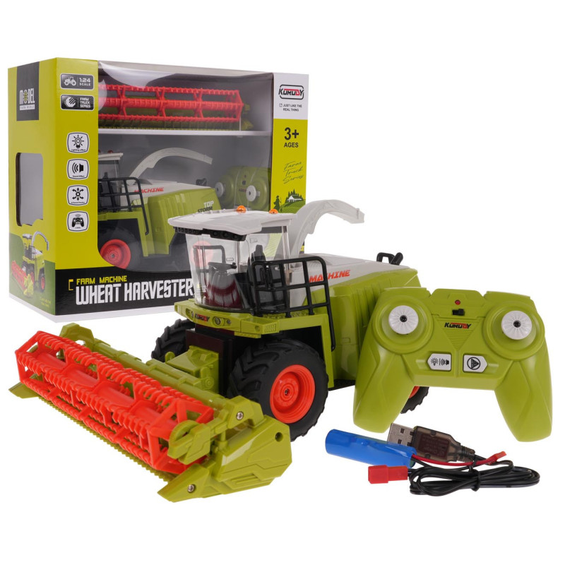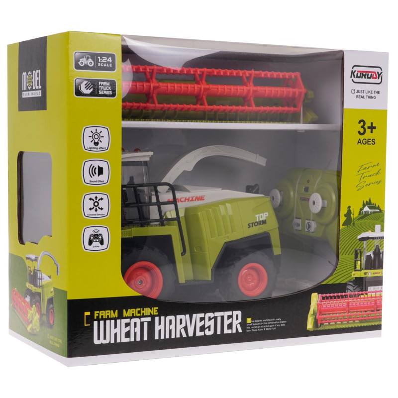 Nuotoliniu būdu valdomas grūdų kombainas su garso ir šviesos efektais, skirtas vaikams nuo 3 metų amžiaus. Transporto priemonė pagaminta iš geriausios kokybės plastiko, ryškiomis spalvomis, yra labai tiksliai atkartota nuo tikros mašinos. Mašina skleidžia garsus ir turi apšvietimą (kabinos priekis ir kabinos stogas). Galime pasukti vamzdį ir pakelti jį aukštyn bei nuleisti žemyn. Galime nuimti pjaunamąją. Kombainas turi gumines padangas, užtikrinančias gerą sukibimą su paviršiumi. Žaislas maitinamas 3,7 V 500 mAh baterija, nuotolinio valdymo pultas – 2 x AA 1,5 V baterijomis (nepridedamos). Žaislas gali veikti demonstraciniu režimu, parodydamas visas savo galimybes.