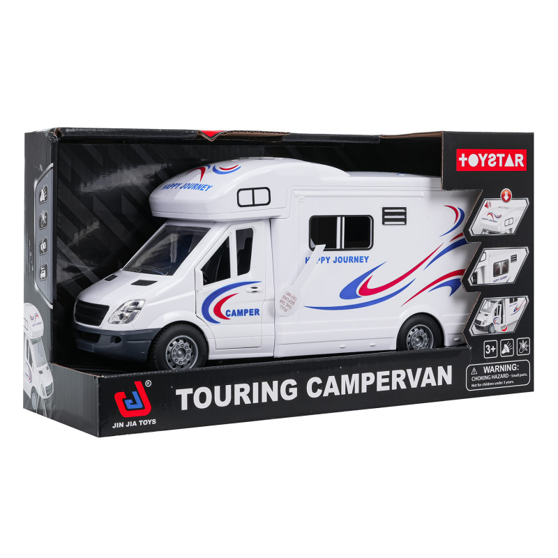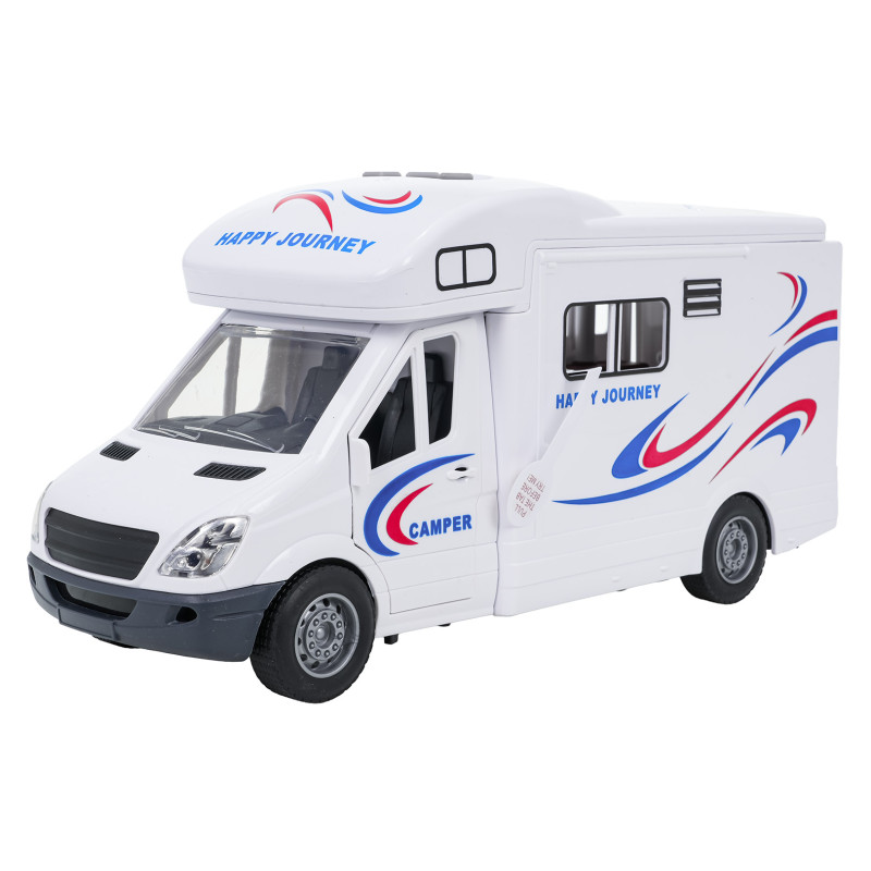 | Interaktyvus kemperis su garso ir šviesos funkcijomis bei atidaromomis durimis, skirtas vaikams nuo 3 metų. Šis žaislas pagamintas iš aukštos kokybės plastiko ir yra saugus vaikams. Kemperyje yra atidaromos šoninės ir galinės durys bei stogas, o dėl guminių ratų ir elektrinės frikcinės pavaros jis lengvai juda žeme. Kemperis turi vidaus apšvietimą ir ant stogo sumontuotą muzikinį skydelį su tikroviškais garso signalais ir važiavimo garsais. Žaislas maitinamas 2 x AA 1,5 V baterijomis (pridedamos). Savybės: - skirta vaikams nuo 3 metų, - žaislas pagamintas iš aukščiausios kokybės medžiagų, - atidaromos šoninės durys, galinės durys ir stogas, - tikroviškas, detalių kupinas apdirbimas, - garso efektai: automobilio užvedimo, garso signalo, važiavimo, durų uždarymo garsai, - apšvietimo efektai: mirksinti šviesa priekabos viduje, - guminės padangos - galios trinties pavara. |