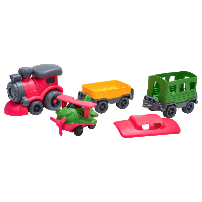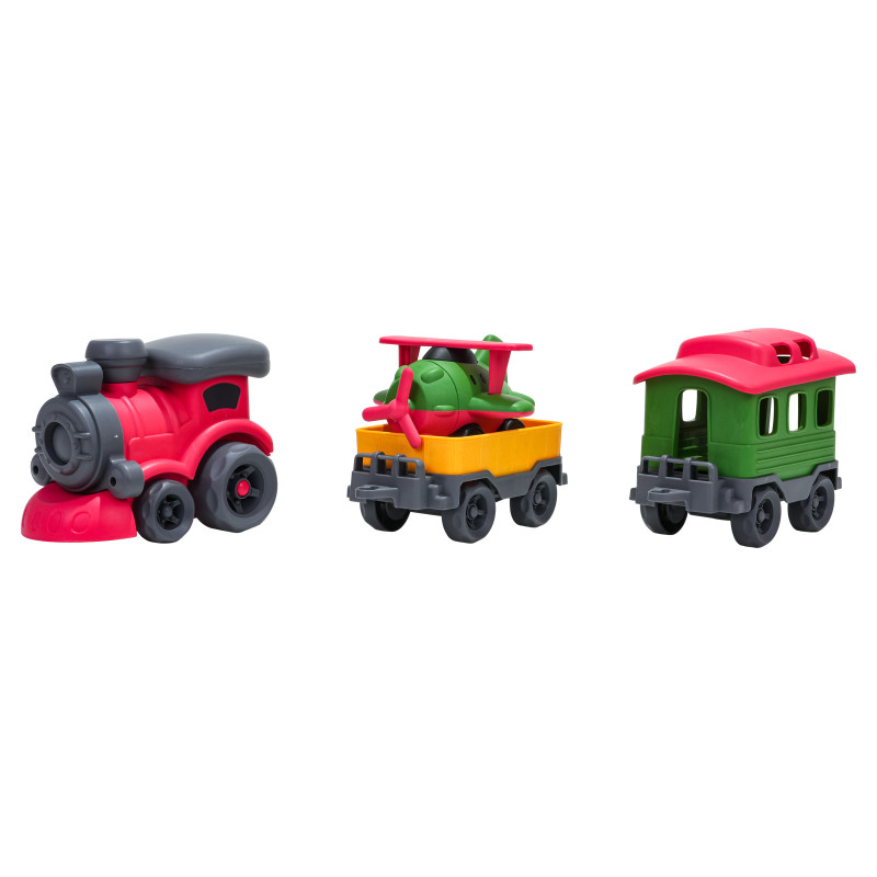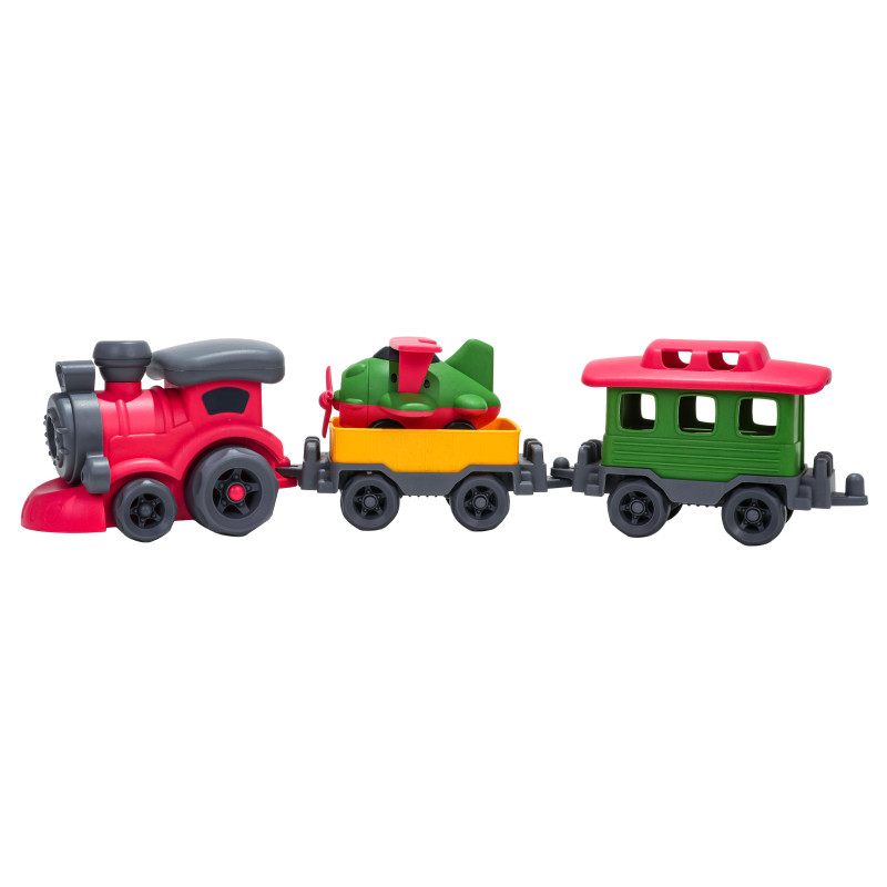 Savybės: - žaislas vaikams nuo aštuoniolikos mėnesių, - pagamintas iš BIOplastiko, netoksiškas, saugus kūdikiams, patvarus, - ryškios spalvos patraukia vaiko dėmesį, - rinkinį sudaro lokomotyvas, du vagonėliai ir lėktuvėlis, - galimybė atjungti lokomotyvą ir kiekvieną vagoną. |