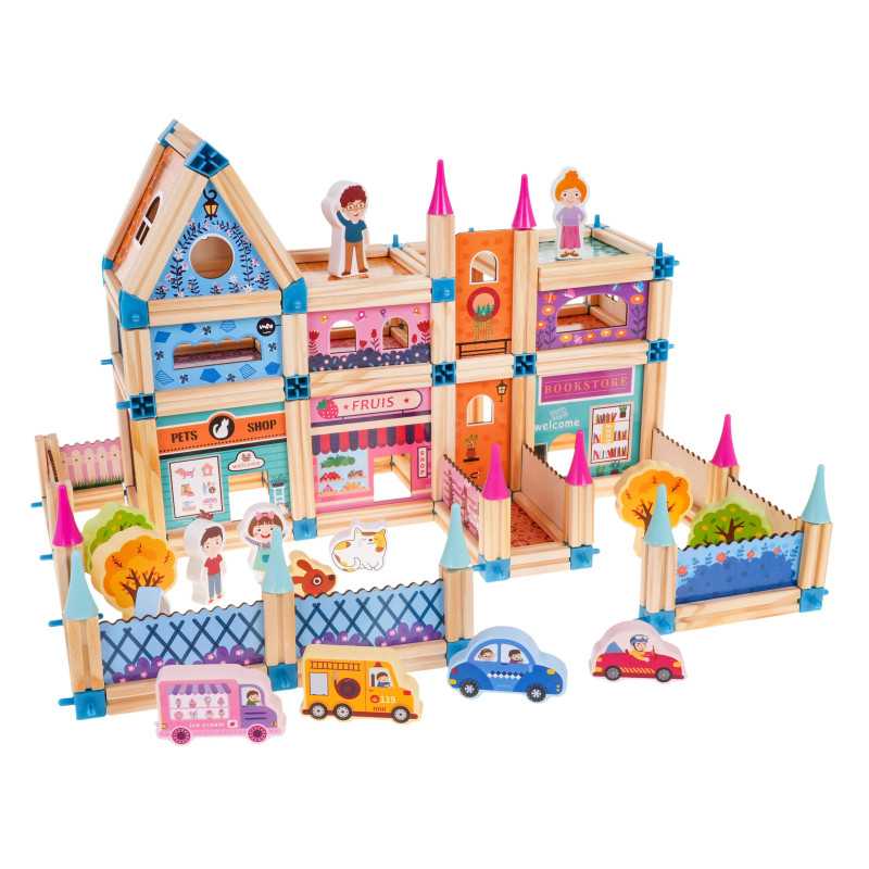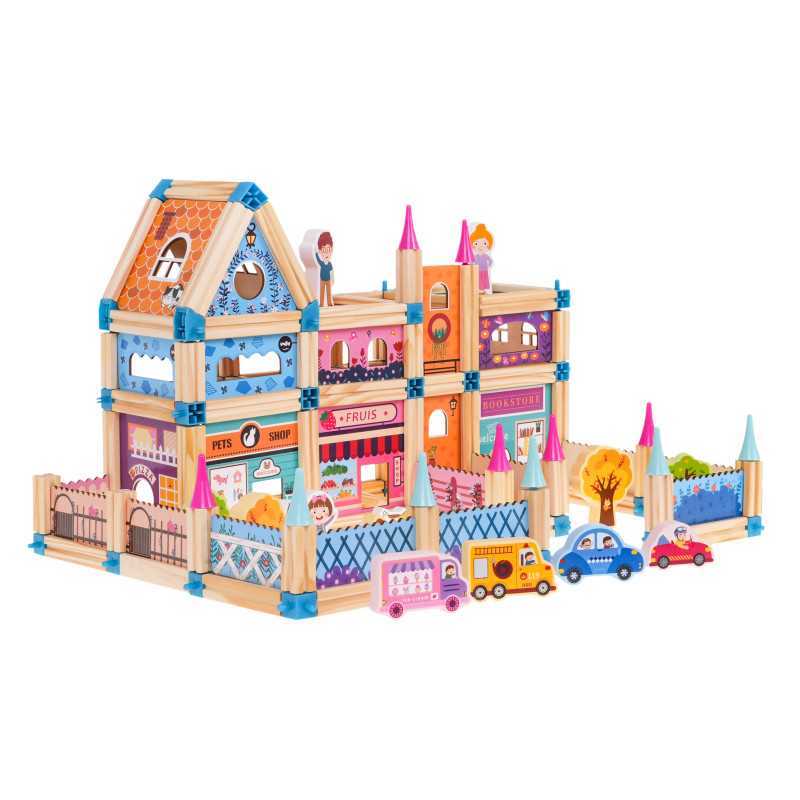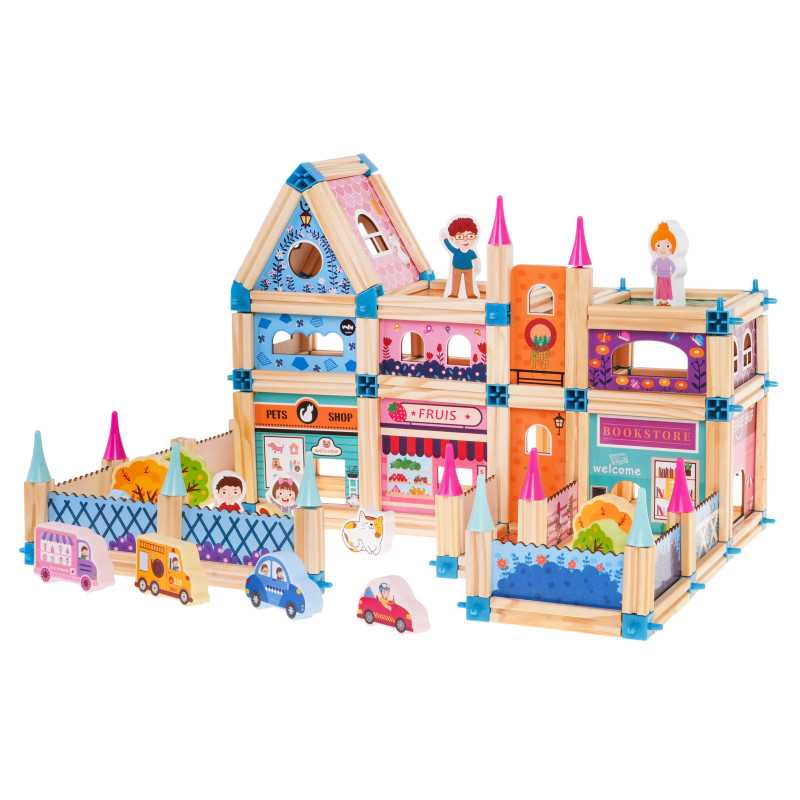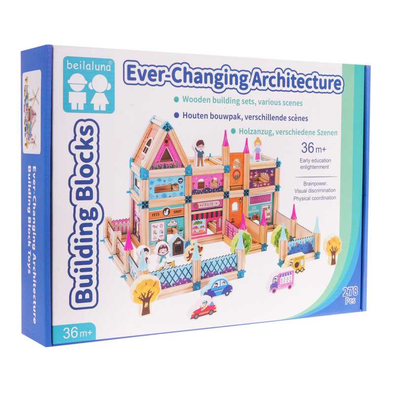 Medinių, spalvingų ir saugių kaladėlių rinkinys vaikams nuo 3 metų. Pakuotę sudaro 278 elementai, kuriuos sudėjus sukuriamas medinis namas.
