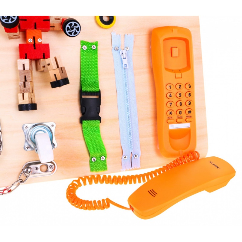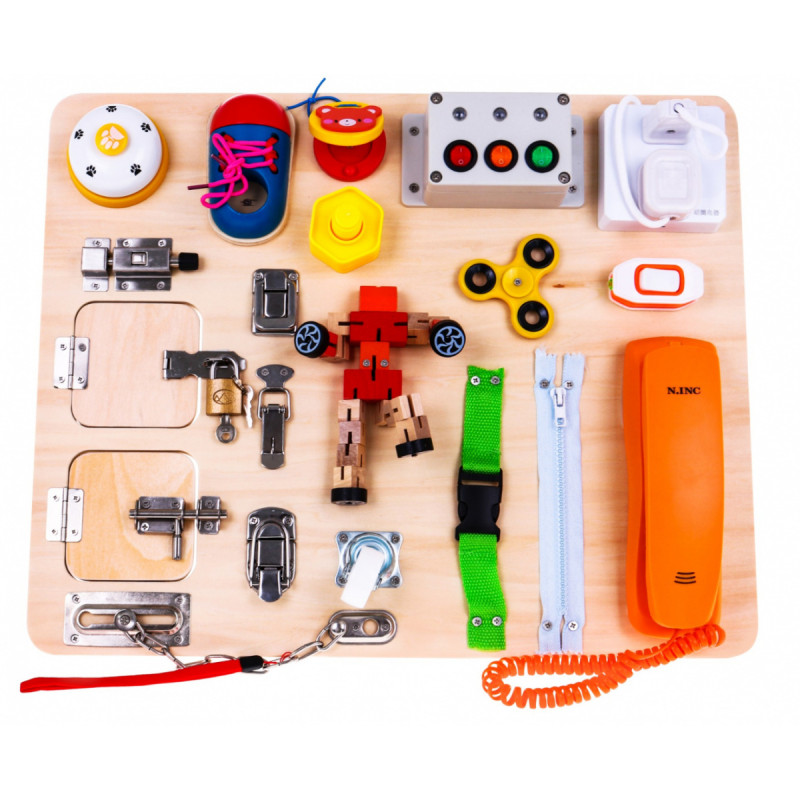| - Telefonas, - ZIP, - pavadėlis, - baldų ratas, - įvairūs apsaugos įtaisai (užraktas, užraktas, vyriai), - įjungimo / išjungimo jungiklis, - suktuvas, - robotas iš medinių kaladėlių, - skambutis, - batas su raišteliu, - lizdas su kištukais, - valdiklis, - pakabinama spyna su raktais, - atrama lentos gale. |
