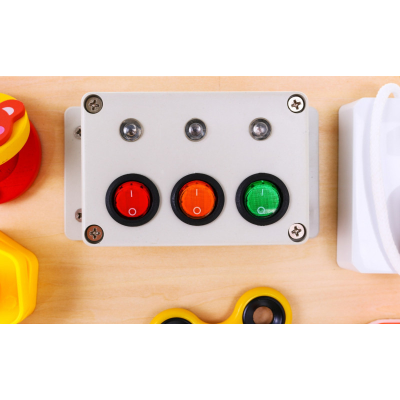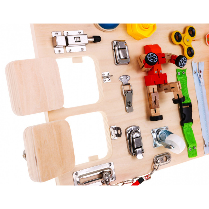 | Medinė daugiafunkcinė lenta yra lavinamasis, sensorinis ir manipuliacinis žaislas, skirtas vaikams nuo 3 metų. Rinkinį sudaro lenta su pritvirtintais elementais, kuriuos vaikas sutinka kasdieniame gyvenime. Žaisdamas su šiuo paketu vaikas palaiko smulkiosios motorikos, loginio mąstymo ir priežasties bei pasekmės analizės įgūdžius. Plokštė turi garso elementų (varpelį) ir šviesos elementų valdiklyje (jungiklius su diodu). Rinkinį maitina 2 x AA tipo baterijos, kurios į rinkinį neįeina. | |