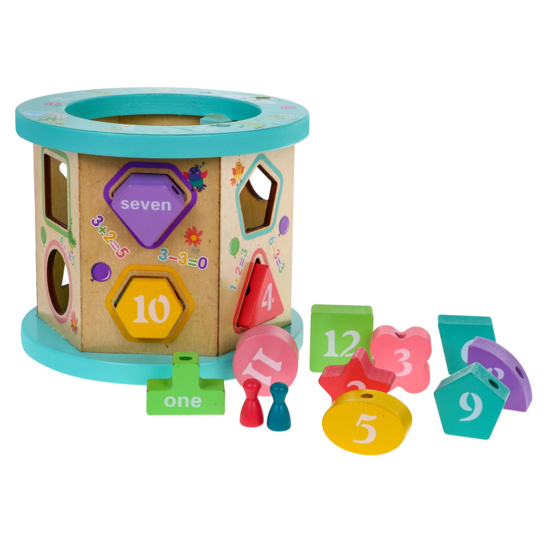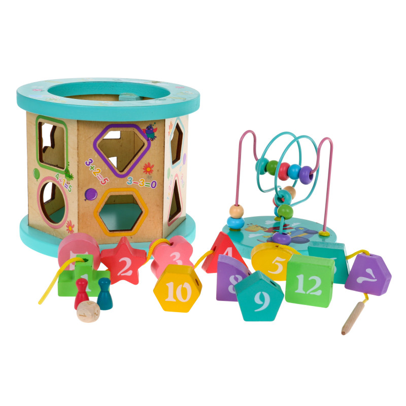 | Medinis, spalvingas, saugus kubas vyresniems nei trejų metų vaikams. Žaidimas su šiuo kauliuku skatina vaizduotę ir kūrybiškumą. Mažylis lavina rankų darbo įgūdžius ir akies-rankos koordinaciją, mokosi atpažinti spalvas ir figūras, atlikti paprastus matematinius veiksmus 0-9 intervale ir išmoksta pirmuosius žodžius anglų kalba. Mediniai kubeliai ir kaladėlės pagaminti iš aukštos kokybės medienos, nudažyti saugiais dažais, jie yra patvarūs ir atsparūs pažeidimams, žaislas tarnaus ilgus metus. Kubo viršuje yra labirintas-dėlionė besisukantiems spalvotiems karoliukams judinti, o apačioje - žaidimo lenta. Kubą sudaro šešios šoninės sienelės. Ant kiekvienos iš sienelių yra matematiniai sudėties ir atimties veiksmai, taip pat yra skylės kaladėlėms, prie kurių reikia pritaikyti atitinkamos formos kaladėlę. Vienoje spalvotų kaladėlių pusėje yra skaičiai nuo 1 iki 12, o kitoje pusėje - skaičių pavadinimai anglų kalba. Rinkinyje taip pat yra virvutė su mediniu galu, ant kurios galime suverti blokelius. |