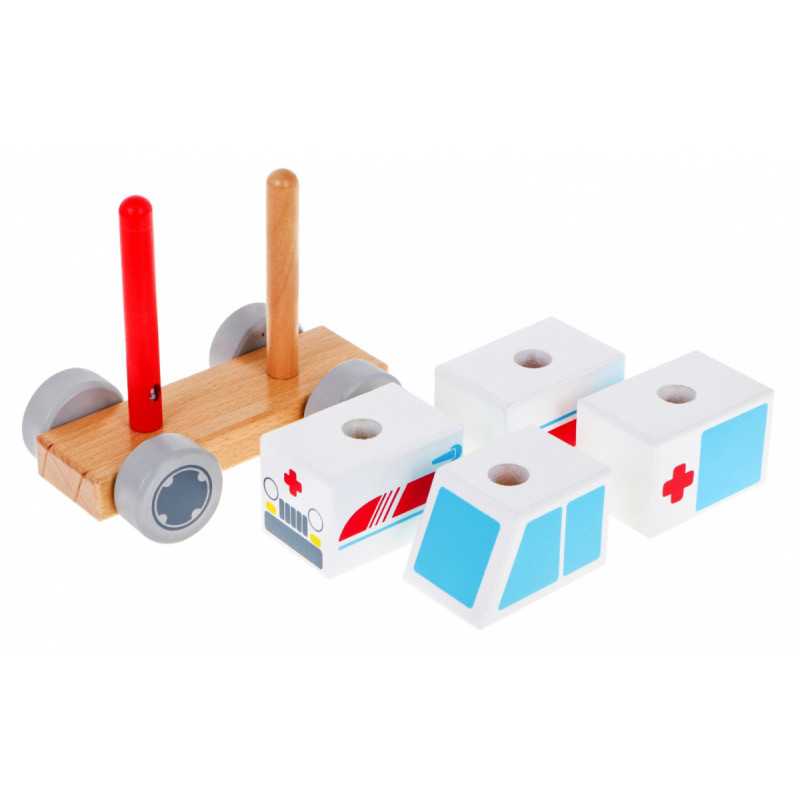 | Medinis greitosios pagalbos automobilis yra žaislas, skirtas kūrybingiems vaikams nuo dvejų metų. Greitosios pagalbos automobilį sudaro pagrindas ir keturios kaladėlės. Prie stovo šonuose pritvirtinti mediniai kilnojamieji apskritimai, o viršuje - 2 kaladėlės. Vaikas deda kaladėles ant smeigtukų, kad sukurtų transporto priemonę. Visi žaislo elementai pagaminti iš medžio, nudažyti netoksiškais dažais. Žaisdamas vaikas palaiko rankų ir akių koordinacijos įgūdžius ir mokosi loginio mąstymo. | |