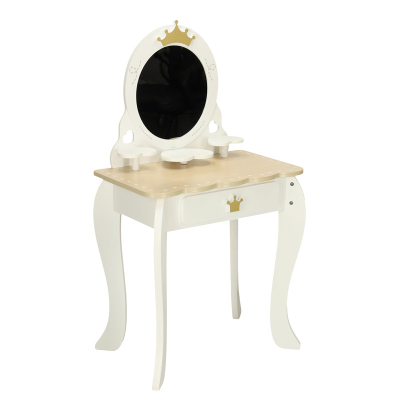 Tualetinis staliukas ir jo priedai pagaminti tik iš medžio, kuris buvo lygiai nušlifuotas ir nudažytas netoksiškais dažais. Dėl baltos ir auksinės spalvų gamos rinkinys yra minimalistinis ir puikiai tinka kaip vaiko kambario puošmena.