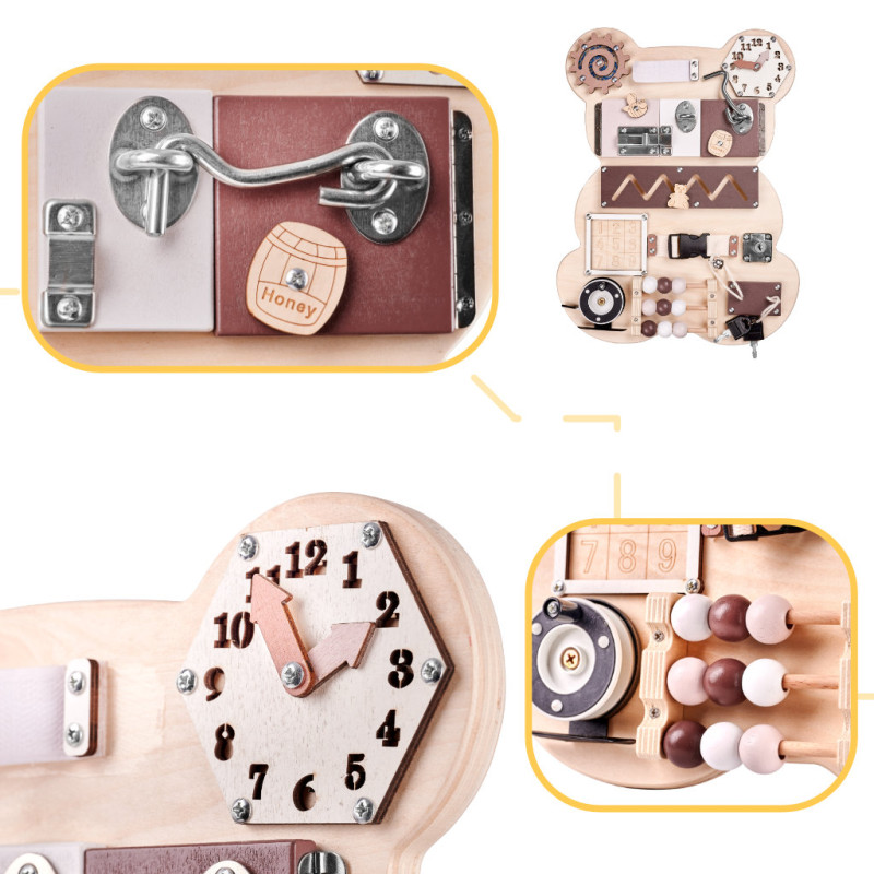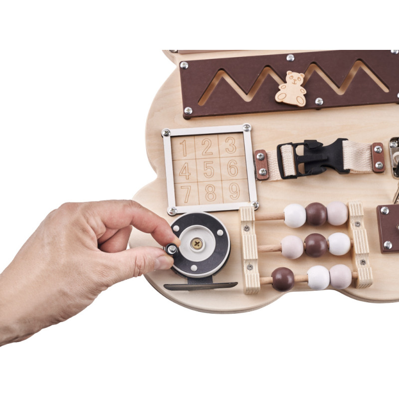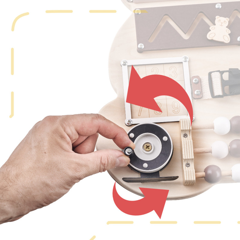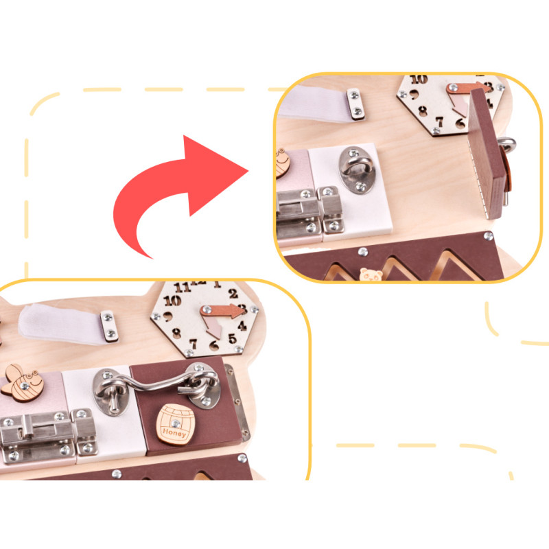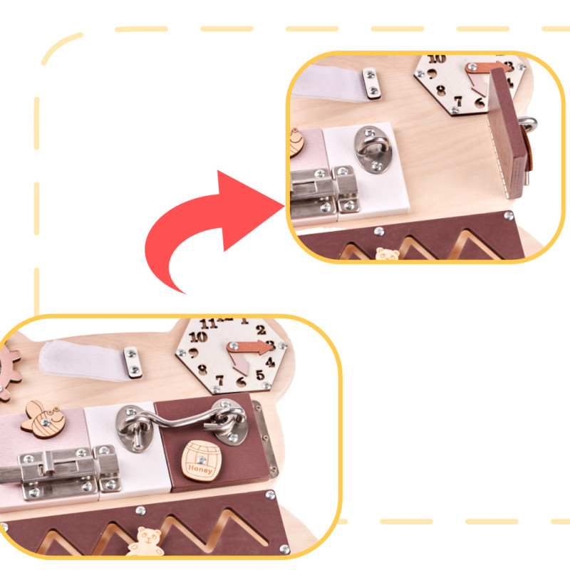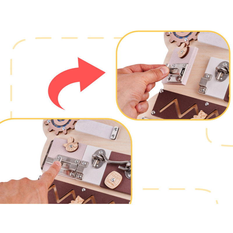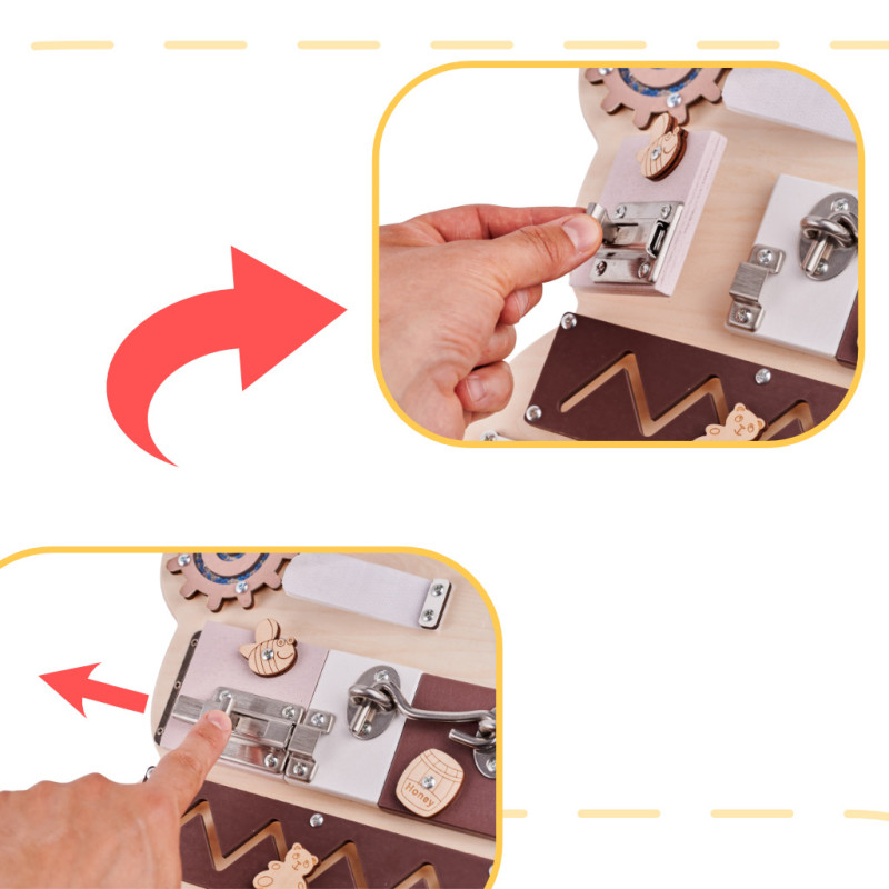 Iš pradžių žaisti su lenta gali būti gana sudėtinga! Atidarant spynas, sagtis ir sprendžiant kitus "galvosūkius" prireiks daug susikaupimo ir dėmesio! Mažylis turės būti kantrus, kad suprastų, kaip veikia kai kurie elementai!
