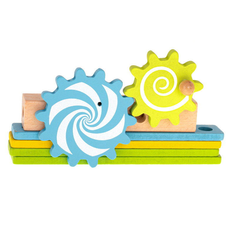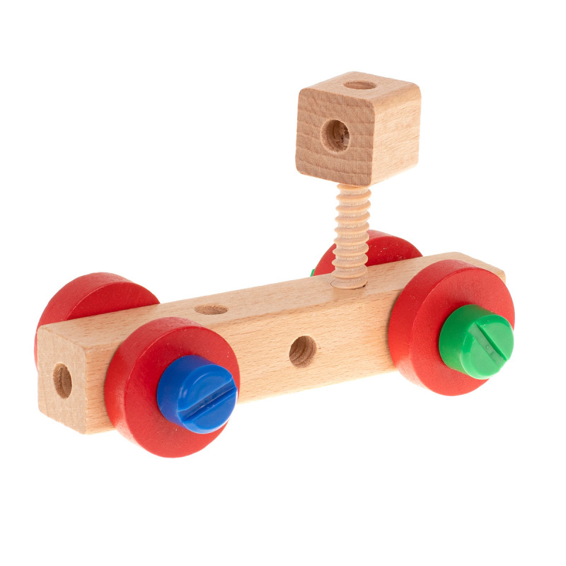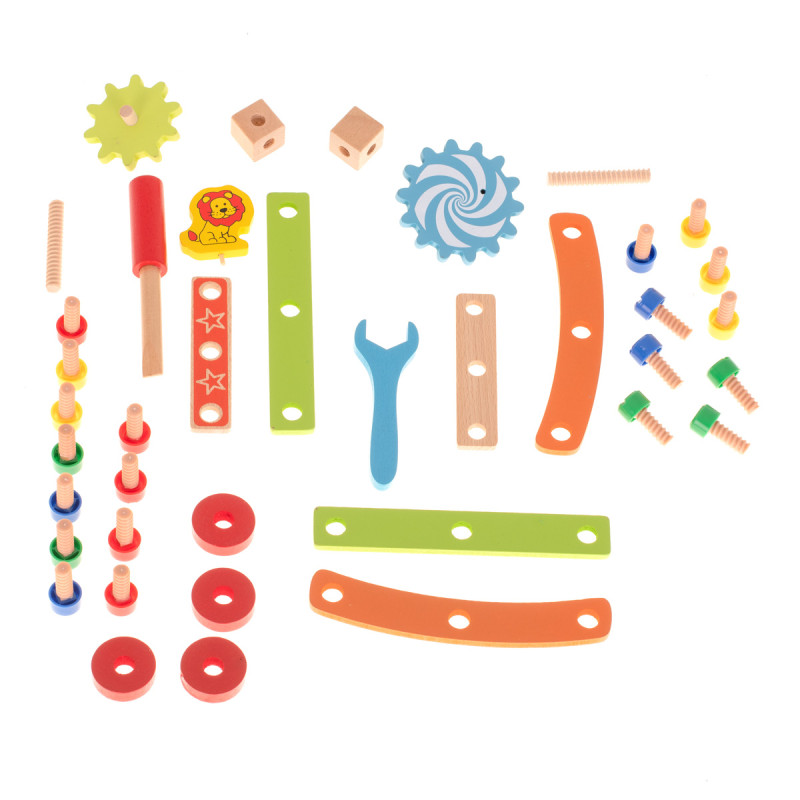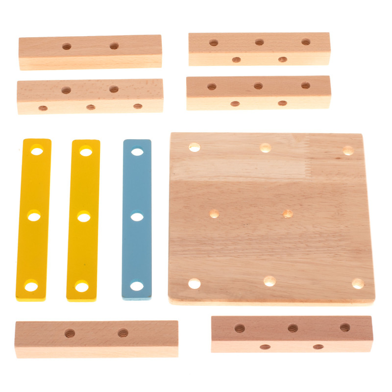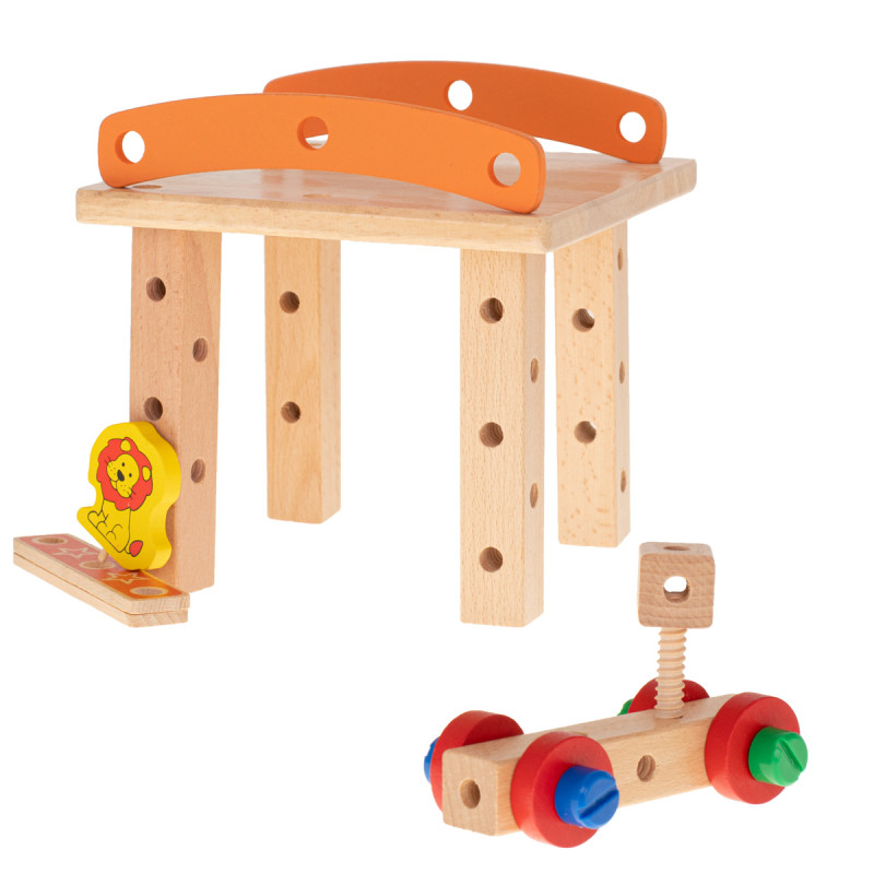 Nuostabus spalvotas medinis žaislas, iš kurio galima statyti dirbtuves su kėdės funkcija ir kitas pasirinktas konstrukcijas.