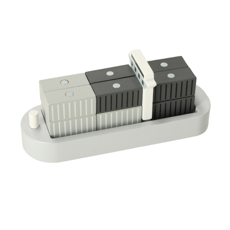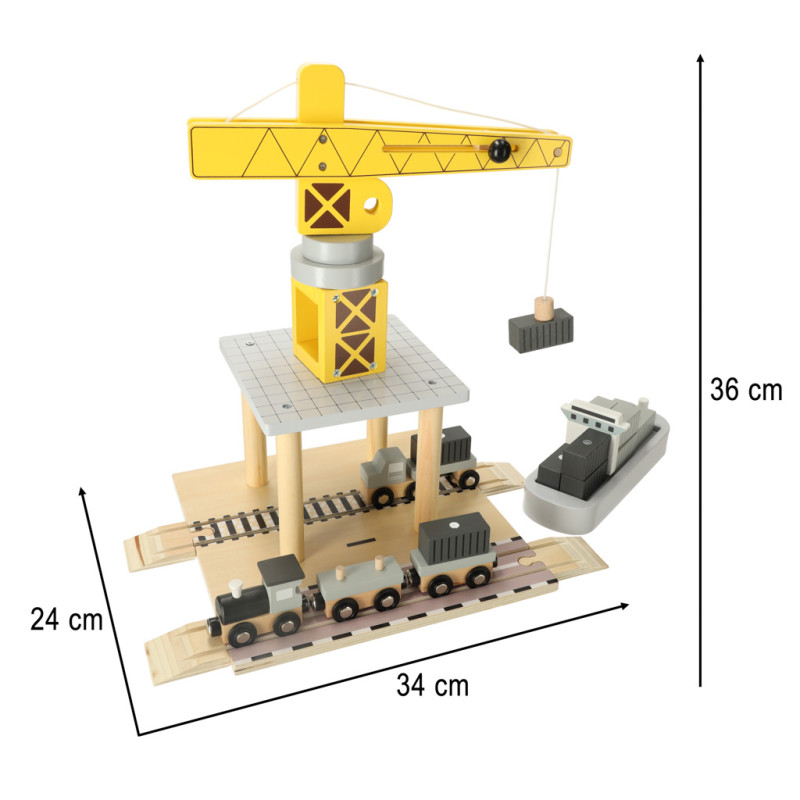 Medinis jūrų uostas su kranu yra puikus žaislas mažiesiems transporto ir statybų entuziastams. Rinkinį sudaro geltonas uosto kranas, kurį galima pasukti ir kelti konteinerius iš laivo į transporto priemones - sunkvežimį ir traukinį su dviem vagonais. Įvairūs komponentai leidžia vaikui suvaidinti scenas kaip tikrame uoste, lavinant jo kūrybiškumą, rankų darbo įgūdžius ir motorinę koordinaciją.