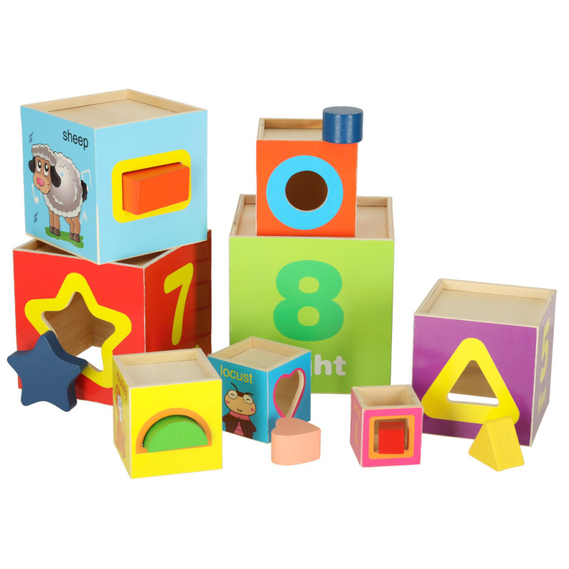 ● 7 medinės rūšiavimo kaladėlės: kvadratas, trikampis, žvaigždė, širdis, apskritimas, stačiakampis ir kt.
