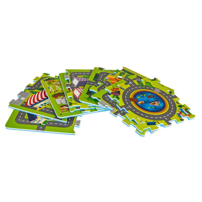 Spalvingos putplasčio dėlionės, dekoruotos grafiškai pavaizduotu miestu, tinka vaikams nuo 10 mėnesių amžiaus. Dėlionės pagamintos iš minkšto ir malonaus liesti putplasčio, jas labai lengva išlaikyti švarias, tereikia nuvalyti drėgnu skudurėliu. Rinkinį sudaro 9 dėlionės, iš kurių galima sukurti kilimėlį, vaizduojantį miestą su gatvėmis, žaliąja zona ir tokiais pastatais kaip: ligoninė, bankas, policijos nuovada, gamykla ir namai. Paruoštas kilimėlis bus puikus pagrindas žaisti su žaisliniais automobiliais. Dėlionės ypatybės: