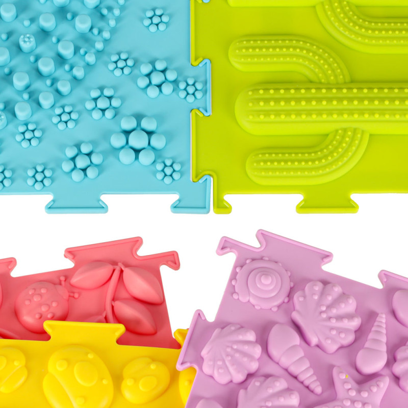 Rinkinį sudaro 8 dėlionės su 6 skirtingomis tekstūromis, kurias mažiausiems vaikams bus labai smagu sudėlioti. Su sensoriniu kilimėliu vaikai gali tyrinėti pasaulį liesdami lytėjimo tekstūras rankomis ar kojomis. Vaikščiojimas ant kilimėlio stiprina motorinius įgūdžius ir padeda išlaikyti pusiausvyrą.