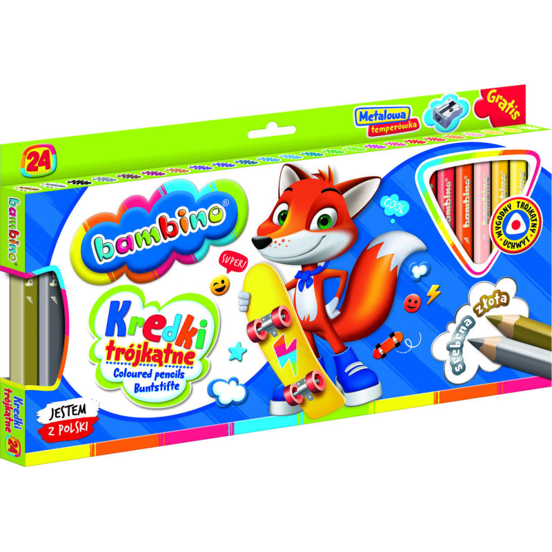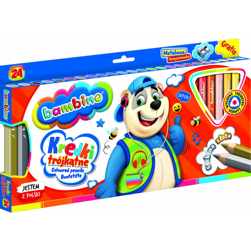 BAMBINO trikampiai pieštukai mediniame rėmelyje 24 spalvos + galąstuvas