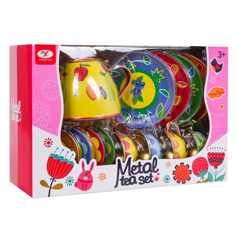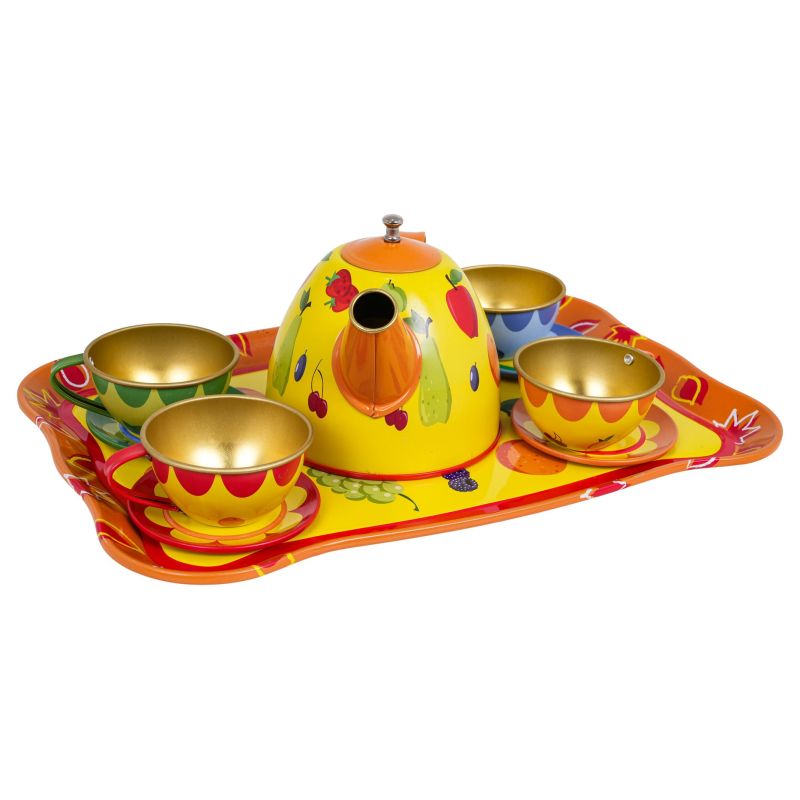 Metalinis, vaisių motyvais puoštas arbatos rinkinys, skirtas vaikams nuo trejų metų amžiaus. Šį 15 dalių rinkinį sudaro viskas, ko reikia jūsų mažyliui, norinčiam patiekti arbatą. Rinkinyje yra arbatinukas, puodeliai, lėkštutės bei padėklas. Visi elementai pagaminti iš metalo ir padengti saugiais, netoksiškais, ryškių spalvų dažais.