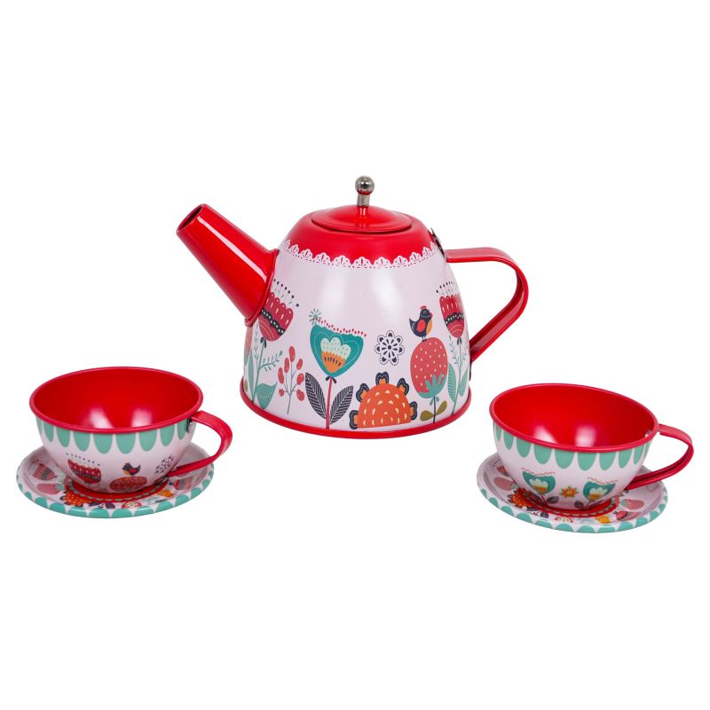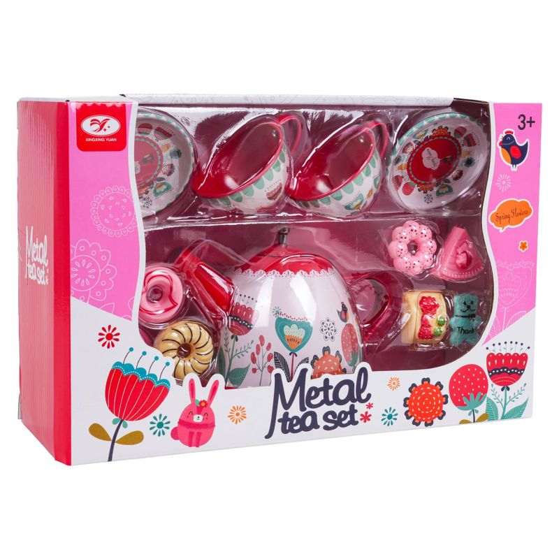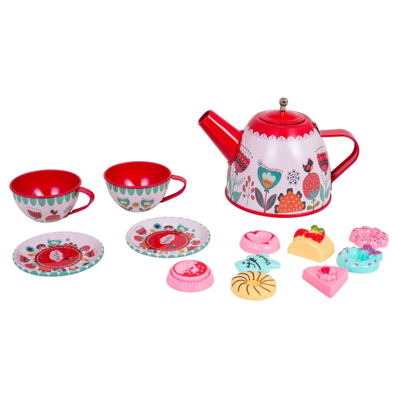 Spalvingas metalinis arbatos rinkinys, skirtas vaikams nuo trejų metų amžiaus. Šį 14 dalių rinkinį sudaro viskas, ko reikia jūsų mažyliui, norinčiam patiekti arbatą ir sausainius. Rinkinyje yra arbatinukas, puodeliai, lėkštutės bei konditerijos gaminių imitacijos. Visi elementai pagaminti iš metalo ir padengti saugiais, netoksiškais, ryškių spalvų dažais.