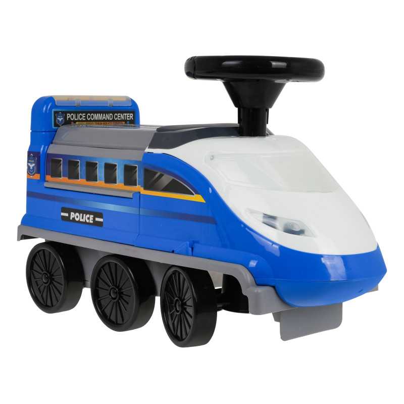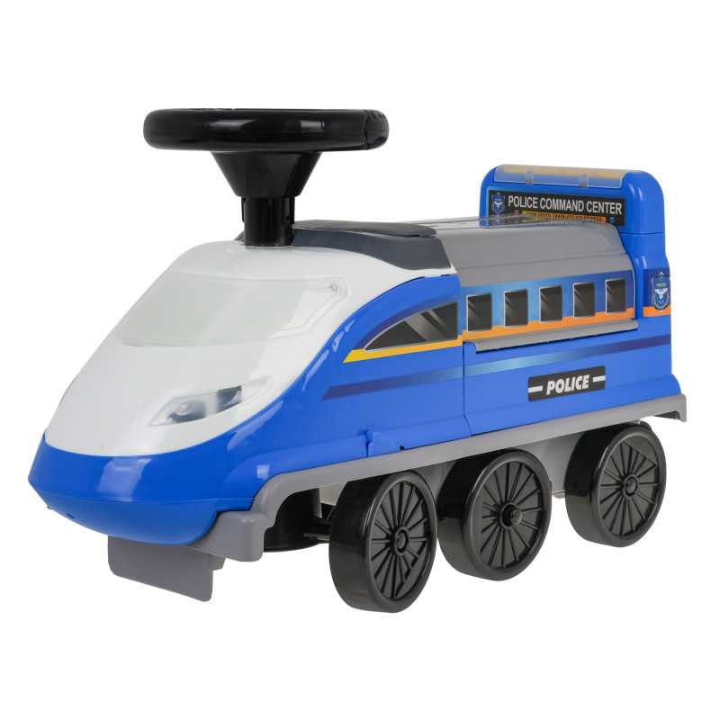 Interaktyvi paspiriama mašinėlė su policijos stovėjimo aikštele ir garso bei šviesos efektais - tai pasiūlymas vaikams nuo 3 metų. Žaislas pagamintas iš aukštos kokybės, patvaraus ir netoksiško plastiko. Mašinėlė turi 6 ratus, įskaitant du priekinius ratus, kurie sukasi pagal kryptį. Po sėdyne yra sulankstoma policijos automobilių stovėjimo aikštelė su čiuožyklomis, judančiu liftu, atidaromu užtvaru, liftu ir besisukančiu ratu. Visi judantys elementai valdomi rankiniu būdu. Po automobilių stovėjimo aikštele taip pat yra vaikų lobių saugykla. Mašinėlės priekyje taip pat yra atidaromas priekinis langas, kuriame yra laisvos vietos įvairiems smulkiems daiktams. Mašinėlės šonuose įrengtos ištraukiamos vaikų kojų atramos. Žaislas maitinamas 2 x 1, 5 V AA baterijomis - vairas ir 2 x 1, 5 V AA baterijomis - garso skydelis (baterijos į komplektą neįtrauktos). Ant vairo yra mygtukas, kuriuo įjungiamos spalvotos mirksinčios lemputės. Mašinėlės gale yra garso skydelis su mygtukais, kuriuos paspaudus galima išgirsti melodijas, pasakas ir gyvūnų garsus. Mašinėlė kalba angliškai. Mašinėlė turi šviečiančius priekinius žibintus. Funkcijos: