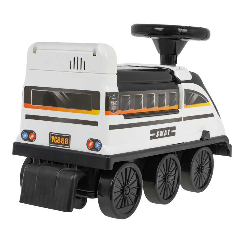 Interaktyvi paspiriama mašinėlė su policijos stovėjimo aikštele ir garso bei šviesos efektais - tai pasiūlymas vaikams nuo 3 metų. Žaislas pagamintas iš aukštos kokybės, patvaraus ir netoksiško plastiko. Mašinėlė turi 6 ratus, įskaitant du priekinius ratus, kurie sukasi pagal kryptį. Po sėdyne yra sulankstoma policijos automobilių stovėjimo aikštelė su čiuožyklomis, judančiu liftu, atidaromu užtvaru, liftu ir besisukančiu ratu. Visi judantys elementai valdomi rankiniu būdu. Po automobilių stovėjimo aikštele taip pat yra vaikų lobių saugykla. Mašinėlės priekyje taip pat yra atidaromas priekinis langas, kuriame yra laisvos vietos įvairiems smulkiems daiktams. Mašinėlės šonuose įrengtos ištraukiamos vaikų kojų atramos. Žaislas maitinamas 2 x 1, 5 V AA baterijomis - vairas ir 2 x 1, 5 V AA baterijomis - garso skydelis (baterijos į komplektą neįtrauktos). Ant vairo yra mygtukas, kuriuo įjungiamos spalvotos mirksinčios lemputės. Mašinėlės gale yra garso skydelis su mygtukais, kuriuos paspaudus galima išgirsti melodijas, pasakas ir gyvūnų garsus. Mašinėlė kalba angliškai. Mašinėlė turi šviečiančius priekinius žibintus. Funkcijos: