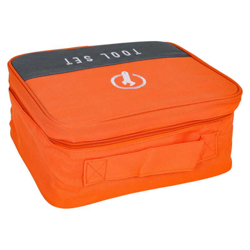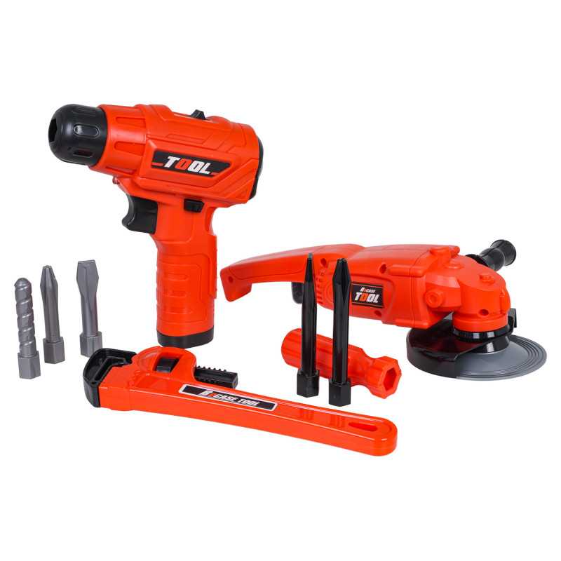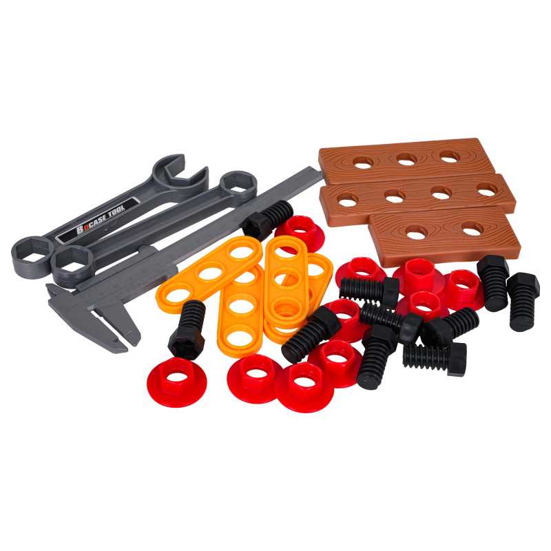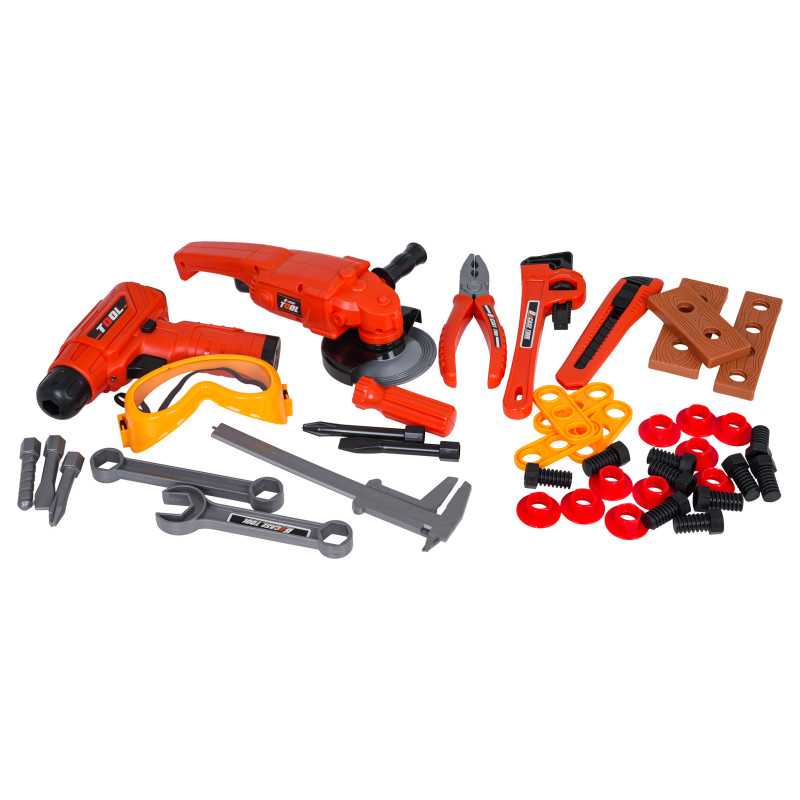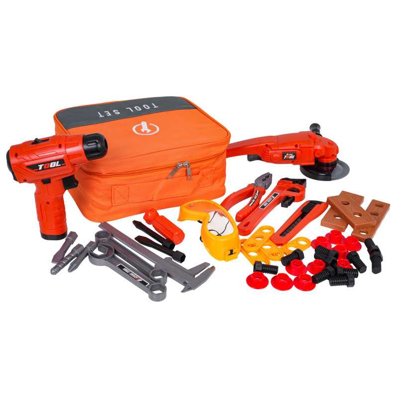 Gerai sukomplektuotas įrankių rinkinys su krepšiu, skirtas vaikams nuo trejų metų. Rinkinys pagamintas iš aukštos kokybės plastiko, skiriant dėmesį detalėms. Šie žaisliniai įrankiai yra visiškai saugūs vaikams. Rinkinį sudaro 42 elementai: įrankių krepšys, šlifuoklis, gręžtuvas/suktuvas, reguliuojamas veržliaraktis, atviras ir uždaras veržliarakčiai, peilis, replės, suportas, apsauginiai akiniai, taip pat varžtai, atsuktuvų antgaliai ir keičiami grąžtai. Gręžtuvas/suktuvas maitinamas 2 x AA 1,5 V baterijomis (baterijos nepridedamos).