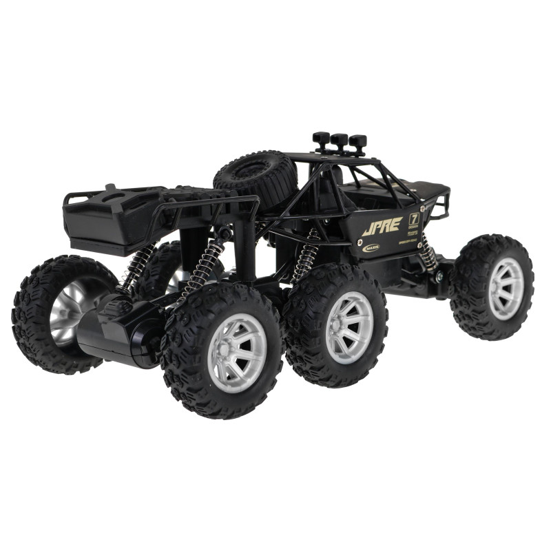 | Metalinė, bekelei pritaikyta, nuotoliniu būdu valdoma šešių ratų transporto priemonė su keturių varomųjų ratų pavara - tai pasiūlymas vaikams nuo 8 metų. Guminės padangos, kiekvieno rato spyruoklinė pakaba leidžia transporto priemonei lengvai įveikti bet kokį paviršių. Transporto priemonė pagaminta iš aukštos kokybės medžiagų, turi metalinį kėbulą, todėl yra patvari. Žaislas maitinamas 3, 7 V baterijomis (pridedamos) -automobiliu ir 2 x AA 1, 5 V (neįtrauktos į komplektą) - nuotolinio valdymo pulteliu. Transporto priemonė įkraunama maždaug per 2 valandas, važiavimo laikas - maždaug 10 minučių. Transporto priemonės savybės: - 1:18 mastelio, - metalinis kėbulas, - konstrukcija nuo susidūrimo, - aukšta amortizuota pakaba, - keturių varančiųjų ratų pavara, - vairo valdymas, - didelės guminės padangos, - įveikia kliūtis, - 27Mhz nuotolinio valdymo pultelis. | |
