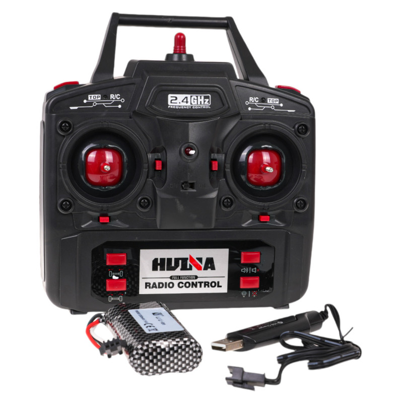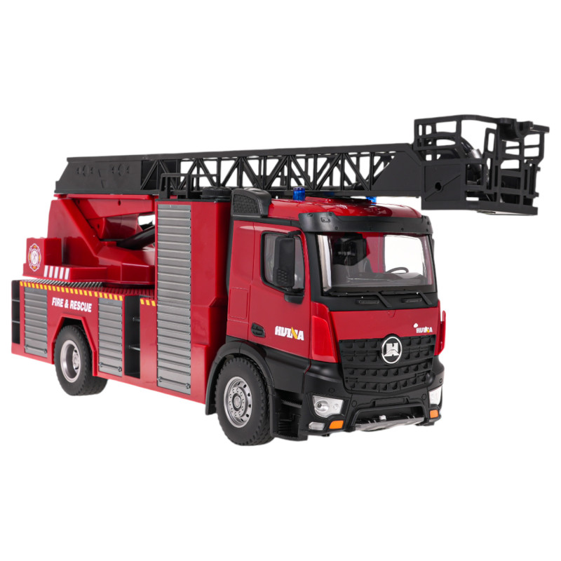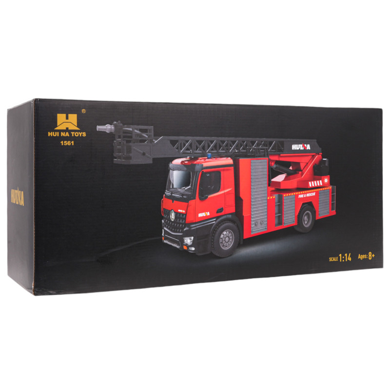 Didelis, nuotoliniu būdu valdomas gaisrinis automobilis, pagamintas 1:14 masteliu. Žaislas skirtas vaikams nuo 8 metų amžiaus. Gaisrinis automobilis yra realistiškai pagamintas iš aukštos kokybės plastiko, turi guminius ratus. Nuotolinio valdymo pultu galite vairuoti sunkvežimį visomis kryptimis (pirmyn-atgal-dešinėn-kairėn). Valdiklis taip pat turi mygtukus, kurie aktyvuoja tokias funkcijas, kaip platformos su strėle sukimas, strėlės pakėlimas ir nuleidimas bei veikianti žarna, purškianti vandenį. Kad gaisrinė žarna veiktų, ją reikia prijungti prie platformos strėlės gale ir supilti vandenį į baką sunkvežimio viršuje. Be to, transporto priemonė turi garso ir šviesos funkcijas, kurias galima išjungti nuotolinio valdymo pulteliu.
