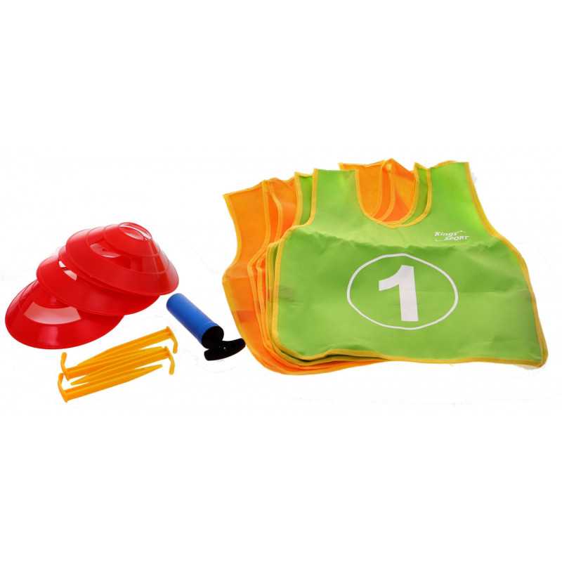 | - vartai su tinklu, - kilimėlis tikslumo pratimams, - kamuolys, - pompa, - 4 liemenės, - 4 kuoliukai, - 6 žymekliai. |