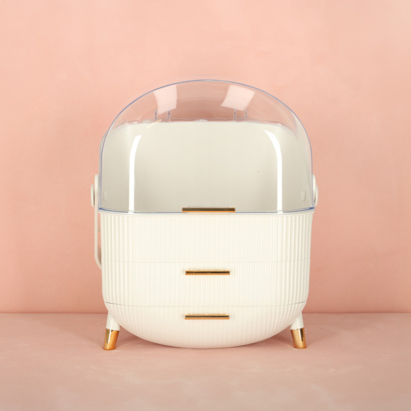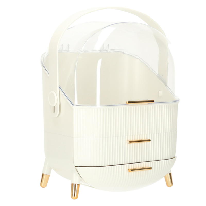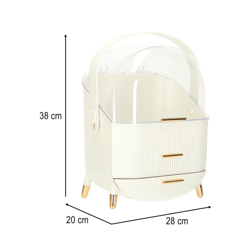 Šis organizuojantis konteineris skirtas žmonėms, norintiems visus savo kosmetikos reikmenis laikyti po ranka ir nepriekaištingai sutvarkytus. Dėl permatomo dangtelio ir dvigubų stalčių galite lengvai laikyti vonios kambario kosmetiką, taip pat papuošalus, šepetėlius, kremus ar makiažo smulkmenas.