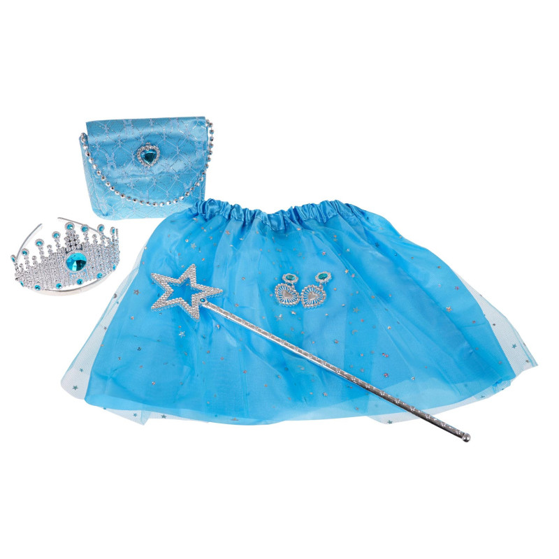 Puikus rinkinys – kostiumas mažajai princesei nuo 3 metų amžiaus. Rinkinį sudaro tiara (karūna), burtų lazdelė, auskarai, rankinė ir sijonas. Rinkinys pagamintas atkreipiant dėmesį į detales, gražia mėlyna spalva.