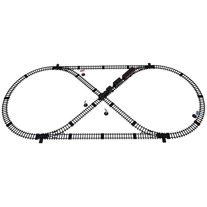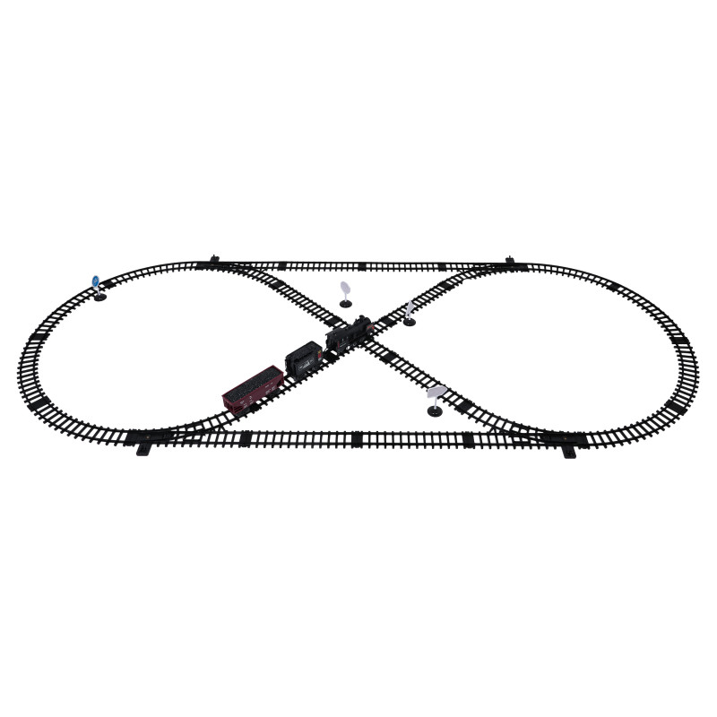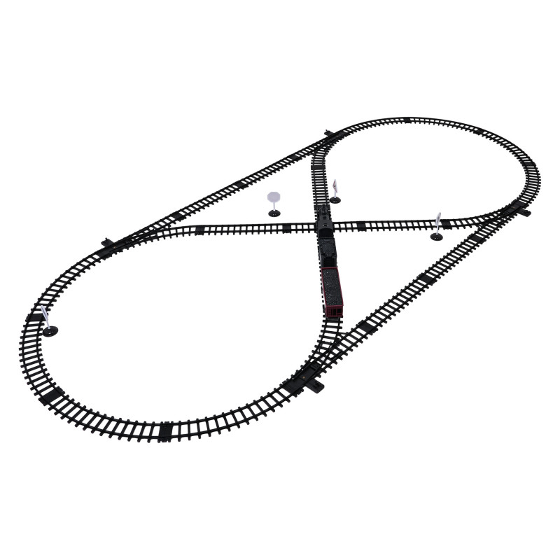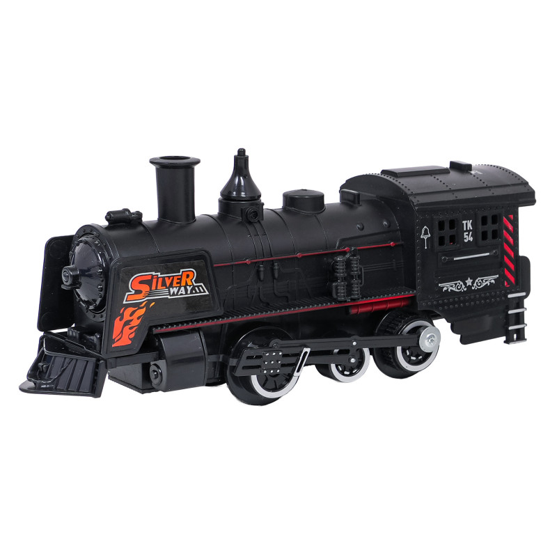 Šis retro traukinio rinkinys su dūmų, šviesų ir garso funkcijomis puikiai tinka vaikams nuo trejų metų. Žaislas maitinamas 4 x 1,5 V AA tipo baterijomis (į komplektą neįeina). Važiuodamas lokomotyvas iš kamino skleidžia dūmus. Pripylus į jį vandens (vandens pipetė pridedama), priekinis žibintas įsižiebia ir galima išgirsti traukinio garsus. Bėgiai yra patvarūs, saugūs ir lengvai prijungiami.