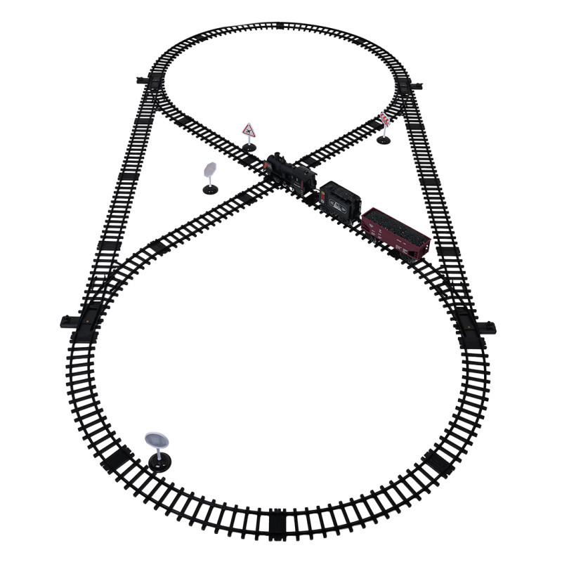 Traukinio bėgių kelias su dūmų, šviesų ir garso funkcijomis