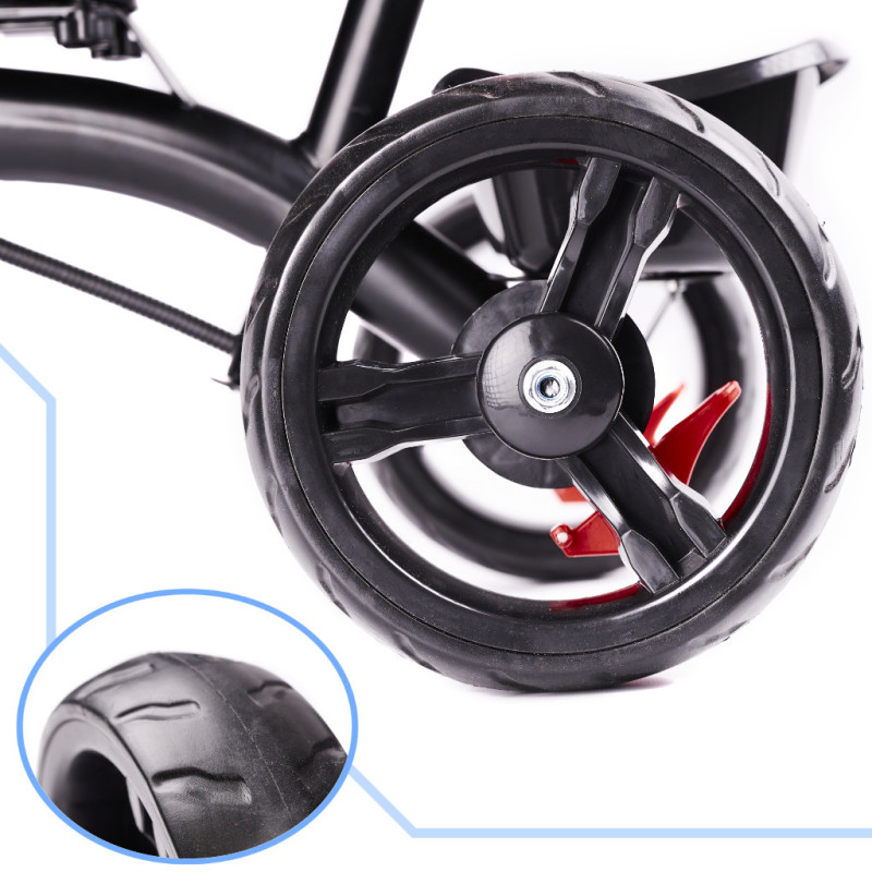 Dviratukas turi atlenkiamas kojų atramas mažesniems vaikams, saugos diržą ir apsauginį turėklą. Kai vaikas šiek tiek paaugs, pradės mokytis važiuoti ir galės pasiekti priekinio rato vairą bei pedalus, kojų atramas ir apsauginį strypą galima nuimti.
