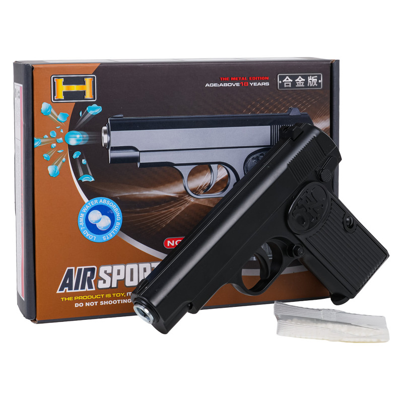 AIR GUN vandens kulkų pistoletas skirtas vaikams nuo 14 metų amžiaus. Pistoletu lengva naudotis, jame naudojamos specialios hidrogelio granulės, kurios nuo smūgio sprogsta. Šiame modelyje naudojamos 7-8 mm skersmens granulės. Į rinkinį įeina neparuoštų granulių paketėlis. Granulės ruošiamos užpilant jas vandeniu ir paliekant mirkti maždaug 4-6 valandas. Šis pistoletas puikiai tinka aktyviam žaidimui lauke.
