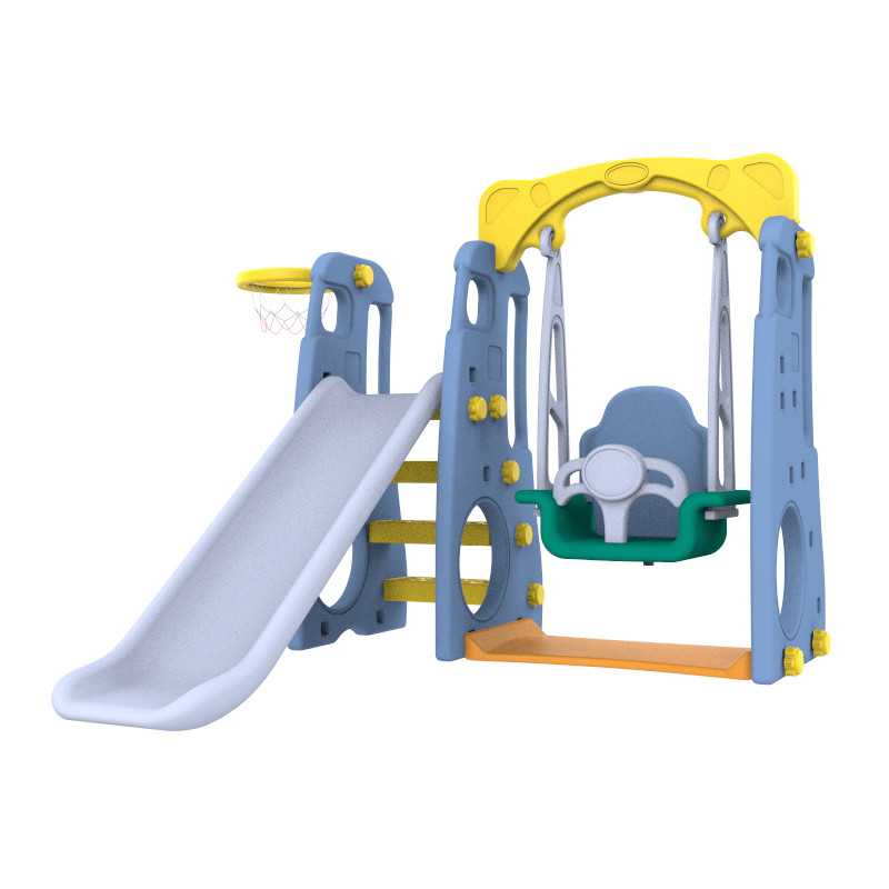 | -plačios stabilios sūpynės, -nuimama supynės apsauga, -tvirtos sūpynių juostos, didinančios stabilumą žaidimo metu, -platus platformos sutvirtinimas konstrukcijomis, -aukštas sūpynių atlošas, -gerai slystanti čiuožykla iš dvigubo plastiko, -platūs ir saugūs čiuožyklos laipteliai, -krepšinio lankas su tinklu, -žaidimo kamuolys, -sūpynių konstrukcija, leidžianti keisti konstrukcijos išdėstymą. | |