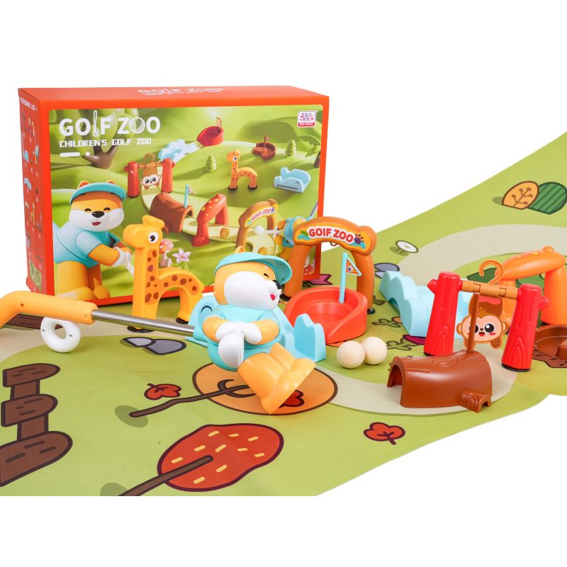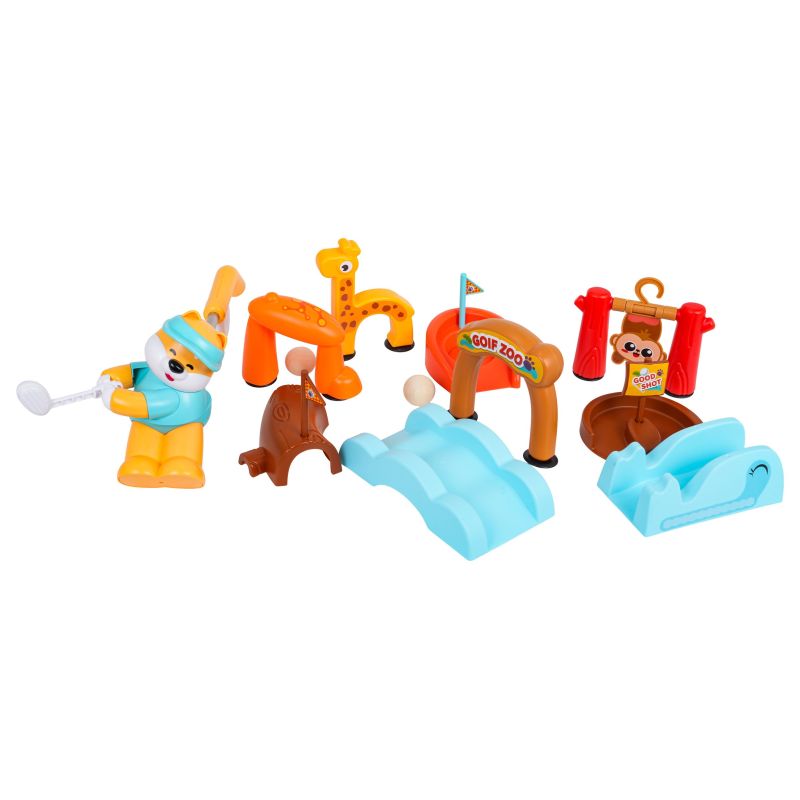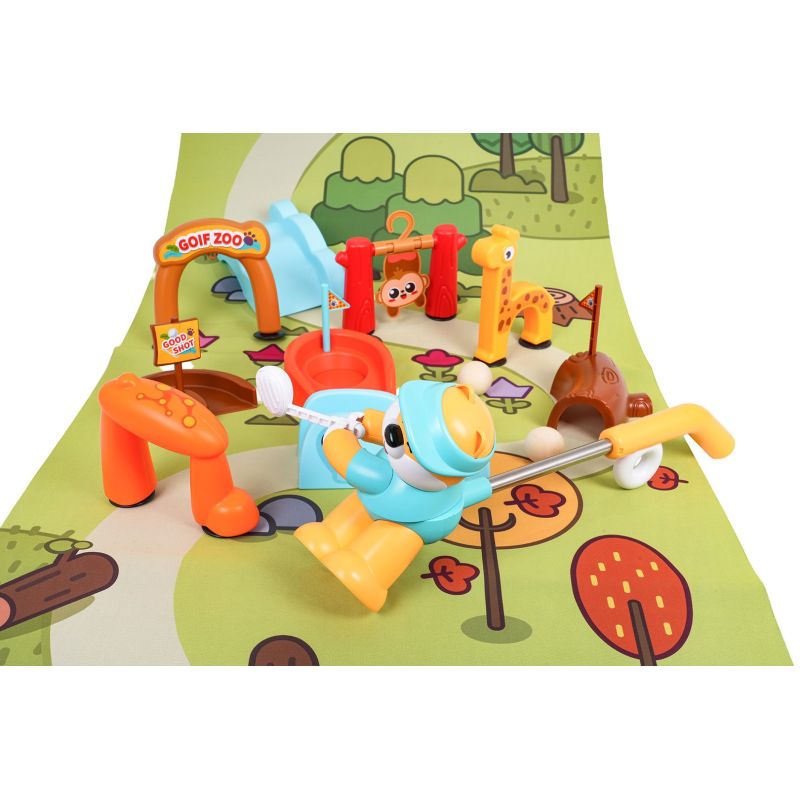 Golfo aikštynas su zoologijos sodo gyvūnais ir putplasčio kilimėliu, skirtas vaikams nuo trejų metų amžiaus. Tai idealus žaislas žaidimams tiek patalpose, tiek lauke. Aikštyno komponentai pagaminti iš aukščiausios kokybės, vaikams saugaus plastiko. Šis žaislas puikiai tinka aktyviam laisvalaikiui. Vaiko užduotis – įmušti kamuoliuką į duobutę. Golfo žaidėjas meškiukas laiko lazdą su ratuku ir slankikliu – patraukus slankiklį į save, lazda smogia į kamuoliuką. Kamuoliukas pagamintas iš medžio, yra lengvas ir sklandžiai rieda. Duobutė maitinama 3 x AG13 baterijomis (pridedamos). Kamuoliukui pataikius į duobutę, pasigirsta fanfaros.