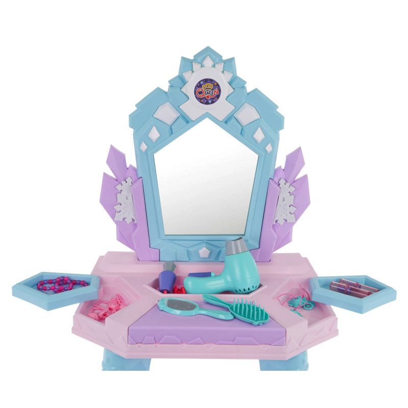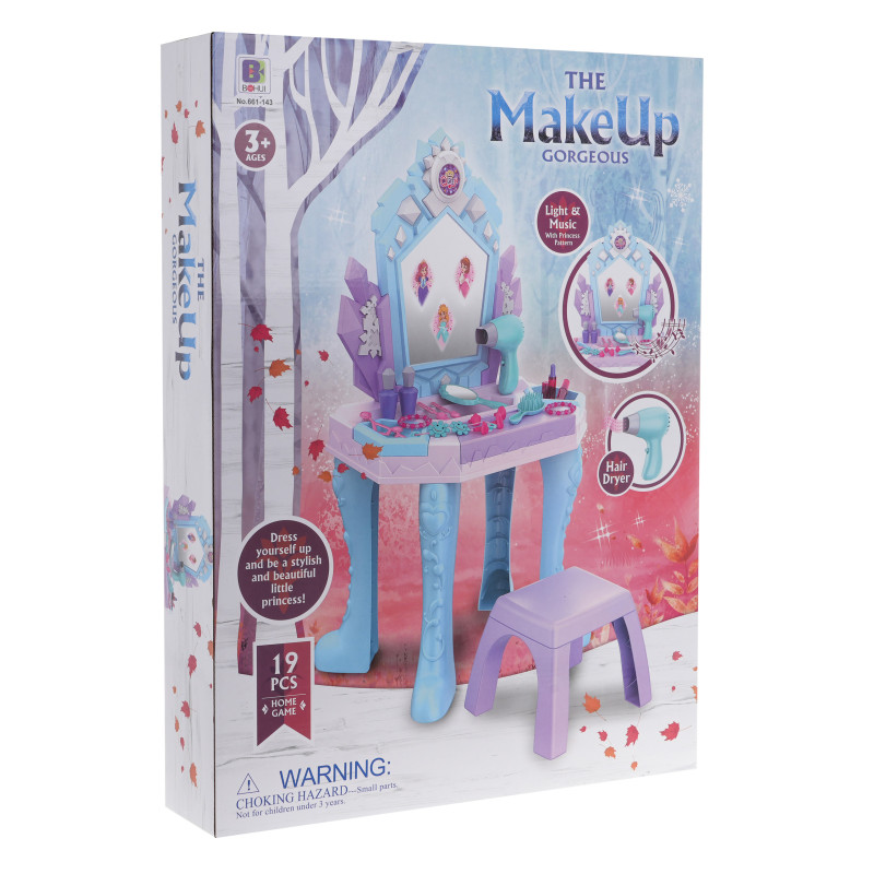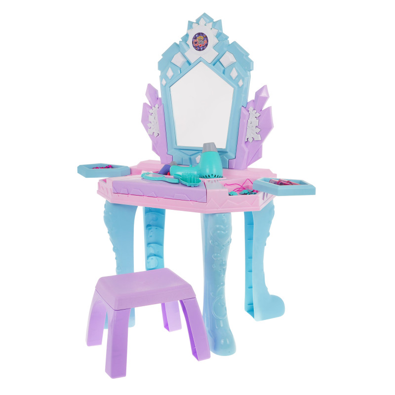 Interaktyvus persirengimo staliukas su garso ir šviesos funkcija skirtas vaikams nuo 3 metų. Rinkinį sudaro tualetinis staliukas su taburete ir netikra kosmetika bei papuošalais. Taip pat yra veikiantis plaukų džiovintuvas su šviesos oro srautu ir džiovinimo garsais. Tualetiniame staliuke yra didelis veidrodis, ant kurio, paspaudus veidrodžio apačioje esantį mygtuką, pasirodo princesės, skambant linksmoms melodijoms. Persirengimo stalelio priekyje ir šonuose yra skyriai kosmetikai ir papuošalams. Tualetinis staliukas maitinamas 3 x AA 1, 5 V baterijomis (į komplektą neįeina). Džiovintuvą maitina 1 x AA tipo baterija (į komplektą neįeina). Tualetinio staliuko savybės: - švieselės - veidrodyje pasirodančios princesės, - garsai - melodijos, džiovinimo garsai, - džiovintuvas su lengvu oro srautu |