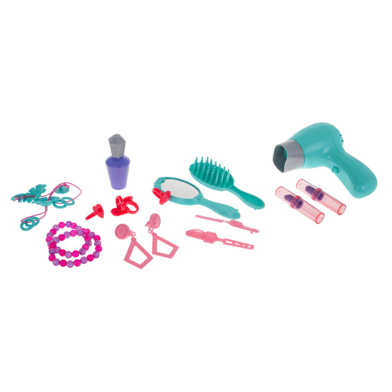 - tualetinis staliukas, - taburetė, - 2 x apyrankė, - auskarai - vienas rinkinys, - 2 x kvepalų buteliukas, - 2 x plaukų sruogos, - 2 x lūpų dažai, - plaukų šepetys, - veidrodis, - plaukų džiovintuvas - 2 x plaukų segtukai, - 4 x žiedas, |
