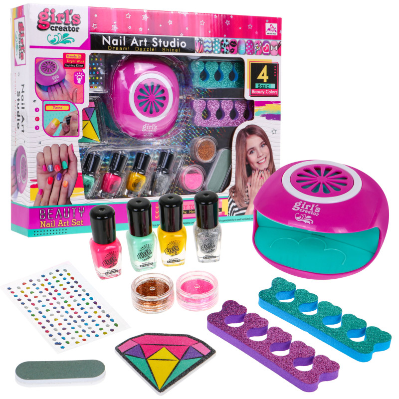 | Saugus rinkinys su garso ir šviesos efektais, skirtas mažajai manikiūrininkei nuo šešerių metų. Rinkinyje yra viskas, ko reikia manikiūrui atlikti. Nagų džiovintuvas tikrai džiovina nagus ir skleidžia džiovinimo garsą, o jo centrinė dalis apšviečiama lemputėmis, maitinimo šaltinis - 2 x AA 1, 5 V (į komplektą neįeina). Nagų lakas yra saugus ir netoksiškas, jį labai lengva pašalinti pasibaigus žaidimui. | |